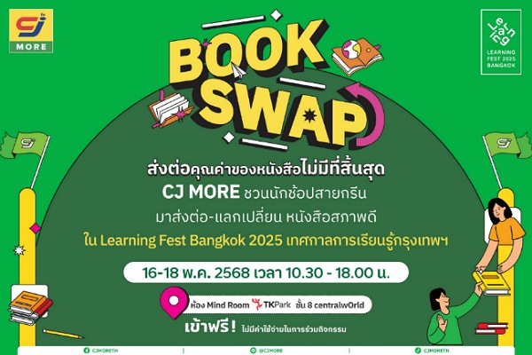 ซีเจ มอร์ (CJ MORE) ผนึกกำลังกับ Learning Fest Bangkok 2025 เทศกาลการเรียนรู้แห่งปีที่จัดโดยสถาบันอุทยานการเรียนรู้ TK Park ร่วมเปิดพื้นที่แห่งการแบ่งปันความรู้และแรงบันดาลใจให้กับคนทุกวัย โดยในปีนี้จัดขึ้นภายใต้แนวคิด “Givetopia – อุดมการ(ณ์)ให้” ส่งกิจกรรม “CJ Book Swap” เชิญชวนนักอ่านนักช้อปสายกรีน นำหนังสือสภาพดีที่ไม่ได้อ่านแล้ว มาแลกเปลี่ยนเป็นหนังสือเล่มใหม่กลับไปอ่านที่บ้านได้แบบฟรี