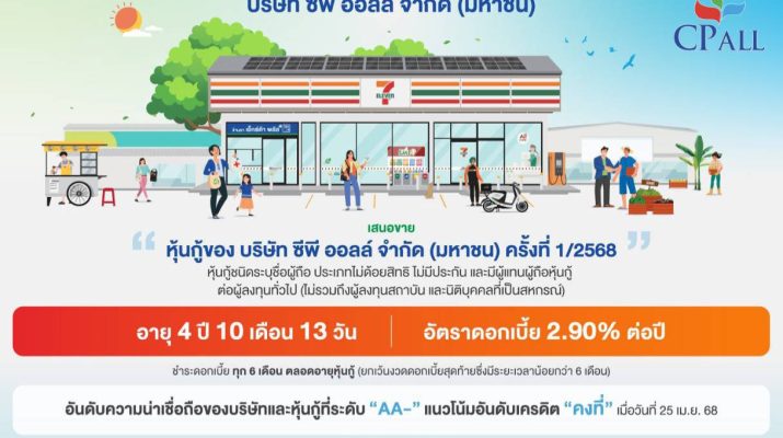 “ซีพี ออลล์” เคาะดอกเบี้ย หุ้นกู้อายุ 4 ปี 10 เดือน 13 วัน 2.90% ต่อปี พร้อมเสนอขายผู้ถือหุ้นกู้เดิม 28-30 พ.ค. และผู้ลงทุนทั่วไป 25-27 มิ.ย. 2568 นี้