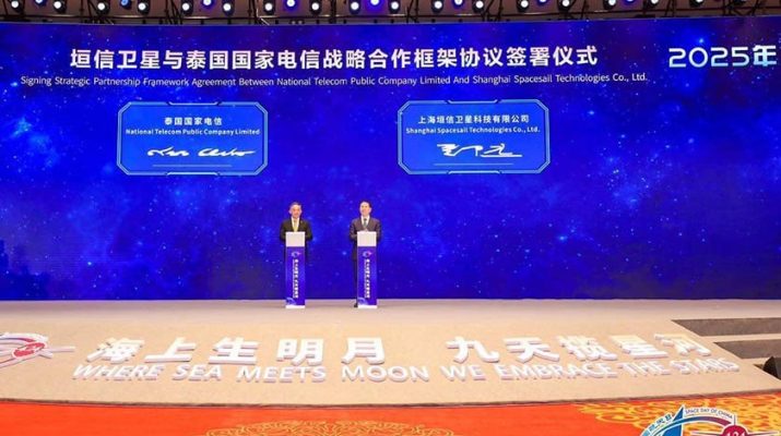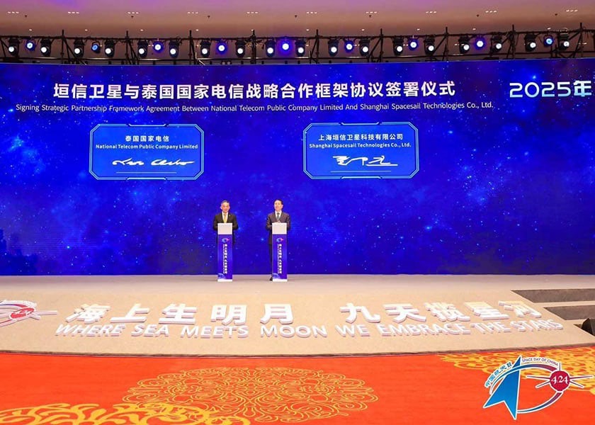 พันเอก สรรพชัยย์ หุวะนันทน์ กรรมการผู้จัดการใหญ่ บริษัท โทรคมนาคมแห่งชาติ จำกัด (มหาชน) (NT) และ Mr. Jason Jie Zheng President of Shanghai Spacesail Technologies Co., Ltd. (SPACESAIL) ลงนามข้อตกลงความร่วมมือเชิงกลยุทธ์โครงการกลุ่มดาวเทียม SPACESAIL ในงาน China Space Conference 2025 ณ นครเซี่ยงไฮ้ สาธารณรัฐประชาชนจีน