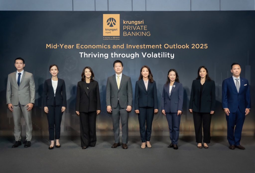 จัดสัมมนา:กรุงศรี ไพรเวท แบงก์กิ้ง นำโดย นายสยาม ประสิทธิศิริกุล (ที่ 4 จากซ้าย) ประธานกลุ่มธุรกิจลูกค้ารายย่อยและลูกค้าบุคคล และนางสาวกนกวรรณ ศุภนันตฤกษ์ (ที่ 3 จากซ้าย) ประธานคณะเจ้าหน้าที่ด้านเครือข่ายการขาย ธนาคารกรุงศรีอยุธยา จำกัด (มหาชน) จัดงาน Mid-Year Economics and Investment Outlook 2025 สัมมนาพิเศษสำหรับลูกค้ากรุงศรี ไพรเวท แบงก์กิ้ง ในหัวข้อ ‘Thriving through Volatility’ โดยได้รับเกียรติจาก ดร.พิมพ์นารา หิรัญกสิ (ที่ 2 จากซ้าย) หัวหน้าทีมวิจัยเศรษฐกิจ และผู้บริหารสายงานวิจัย ธนาคารกรุงศรีอยุธยา จำกัด (มหาชน) พร้อมด้วยพันธมิตรผู้เชี่ยวชาญด้านการลงทุนจาก Allianz Global Investors, First Sentier Investors และ Schorders มาร่วมอัปเดตสถานการณ์เศรษฐกิจและตลาดการลงทุนทั่วโลกในช่วงครึ่งปีหลังของปี 2568 ที่ยังคงผันผวนท่ามกลางความไม่แน่นอนจากหลายปัจจัย พร้อมเจาะลึกโอกาสการลงทุนในยุโรป จีน และอินเดีย รวมถึง Private Asset และ Structured Notes งานสัมมนาดังกล่าวจัดขึ้นเมื่อเร็วๆ นี้ ณ โรงแรมโฟร์ซีซั่นส์ กรุงเทพฯ ริมแม่น้ำเจ้าพระยา