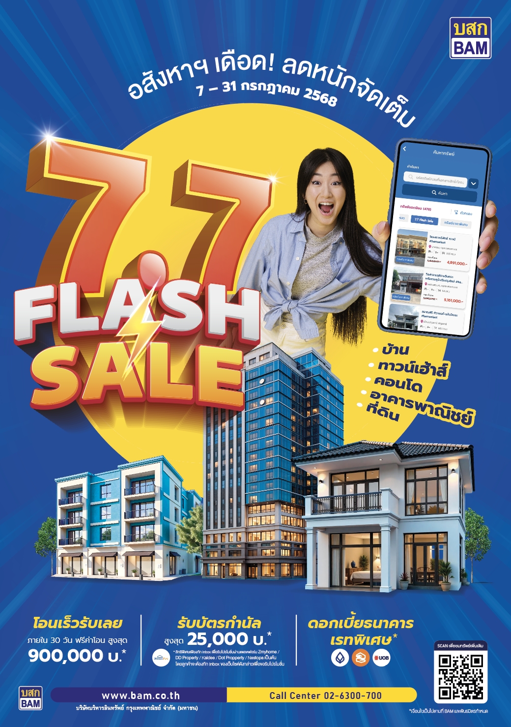 บริษัทบริหารสินทรัพย์ กรุงเทพพาณิชย์ จำกัด (มหาชน) หรือ BAM เดินหน้ากระตุ้นตลาดอสังหาริมทรัพย์ จัดแคมเปญใหญ่ “BAM FLASH SALE 7.7” ระหว่างวันที่ 7 – 31 กรกฎาคม 2568 ขนทรัพย์สินรอการขาย ทั้งบ้านเดี่ยว ทาวน์เฮ้าส์ คอนโดมิเนียม อาคารพาณิชย์ ที่ดิน กว่า 170 รายการ มูลค่ารวมกว่า 550 ล้านบาท มาลดราคาพิเศษ สูงสุดกว่า 30 % ลูกค้าที่ซื้อทรัพย์ภายใต้แคมเปญและโอนกรรมสิทธิ์ภายใน 30 วัน นับจากวันอนุมัติ จะได้รับสิทธิพิเศษทันที ได้แก่ ฟรีค่าโอน สูงสุด 900,000 บาทบัตรกำนัล มูลค่าสูงสุด 25,000 บาท พร้อม สินเชื่ออัตราดอกเบี้ยพิเศษ จากธนาคารพันธมิตรที่เข้าร่วม นอกจากนี้ ใครที่กำลังมองหาอสังหาฯ ทั้งเพื่ออยู่อาศัยหรือลงทุน ห้ามพลาดกิจกรรม “BAM TROOP” ลงพื้นที่วันที่ 7 เดือน 7 พบกันได้ที่ ตลาดละลายทรัพย์ สีลม BTS ช่องนนทรี และ ตลาดรวมทรัพย์ อโศก
