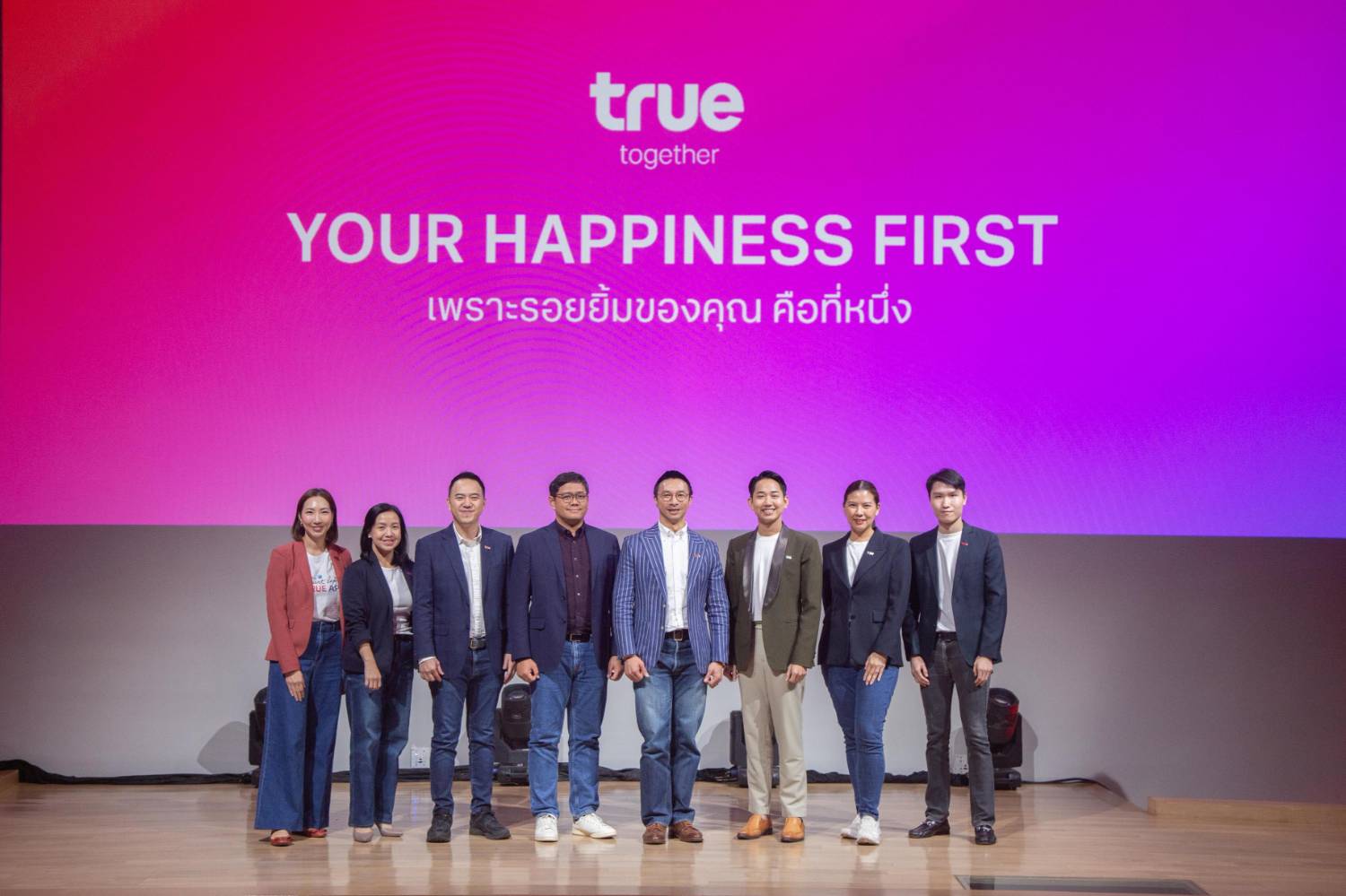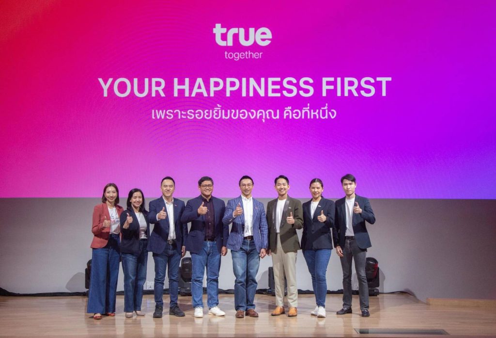 นายฐานพล มานะวุฒิเวช หัวหน้าคณะผู้บริหารด้านการตลาด บริษัท ทรู คอร์ปอเรชั่น จำกัด (มหาชน) กล่าวว่า “ทรู คอร์ปอเรชั่น พร้อมเดินหน้าสร้างความสุขในทุกมิติ ยกระดับคุณภาพชีวิตของผู้ใช้บริการทั่วประเทศ ผ่านการเชื่อมต่อที่ไม่ใช่เพียงแค่สัญญาณที่ต้องดีที่สุด แต่คือความเข้าใจและความใส่ใจที่แท้จริง โดยยึดลูกค้าเป็นหัวใจของทุกการขับเคลื่อน ซึ่งในยุคดิจิทัลนี้จากข้อมูลเทรนด์ความสุขของลูกค้า พบว่าลูกค้าให้ความสำคัญอย่างมากกับประสบการณ์การเชื่อมต่อระหว่างออนไลน์และออฟไลน์ที่ต้องเป็นไปอย่างราบรื่นไร้รอยต่อในทุกดิจิทัลไลฟ์สไตล์ ซึ่งสอดคล้องกับตัวเลขการเติบโตของคนไทยที่รับชมคอนเทนต์สตรีมมิ่งผ่านมือถือและอุปกรณ์เชื่อมต่อ เช่น สมาร์ททีวี แท๊บเล็ต เพิ่มสูงขึ้น ถึง 54% เนื่องจากใช้งานง่าย สะดวก ใช้ได้ทุกที่ทุกเวลา โดยเฉพาะกลุ่ม Gen Z และกลุ่มมิลเลนเนียล ขณะเดียวกันตลาดดิจิทัลในประเทศไทยเติบโตอย่างต่อเนื่อง โดยมีจำนวนผู้ที่ใช้บริการดิจิทัลแบบจ่ายค่าบริการสูงถึง 25 ล้านคน ซึ่งมีค่าใช้จ่ายเฉลี่ย 250 บาทต่อเดือน และ 21.6% จ่ายค่าบริการเพื่อดูหนัง และทีวีแบบ Subscription (SVOD) โดยมีการใช้บริการดิจิทัล 2-4 บริการต่อคน นอกจากนี้ยังพบว่า 5 อับดับแรก ของบริการด้านดิจิทัลที่คนไทยจ่ายเงิน Subscription ได้แก่ 1. SVOD ทีวีและภาพยนตร์ 82% 2. มิวสิก 51% 3. ฟู้ดเดลิเวอรี่ 46% 4. กีฬา 36% และ 5. เกมมิ่ง 30% ขณะเดียวกันจากข้อมูลการใช้บริการ OTT แอปของลูกค้าทรู ดีแทคก็มีการเติบโตเพิ่มขึ้น 19% จากปีที่ผ่านมา และมีจำนวนผู้ใช้งาน OTT 2 แอปขึ้นไป เพิ่มขึ้น 11% ซึ่งการให้ความสำคัญกับเทรนด์และข้อมูลการใช้งานต่างๆของลูกค้าที่ปรับเปลี่ยนไปในหลากหลายมิติ รวมทั้งการใส่ใจข้อมูลอินไซต์ของลูกค้าจริง ทำให้มีการออกแบบแคมเปญที่เชื่อว่าจะตอบโจทย์ทุกไลฟ์สไตล์และสร้างรอยยิ้มให้กับลูกค้าทั่วประเทศ ซึ่งเป็นที่มาของภารกิจ “Your Happiness First” ที่จัดเตรียม 3 แคมเปญความสุข ได้แก่ 1. สุข…กับแพ็กเกจให้ชีวิตบันเทิงกว่าที่เคย 2. สุข…ลุ้นล้าน ใช้ชีวิตดิจิทัลง่ายขึ้นผ่าน True App และ 3. สุข…กับเซอร์ไพรส์ ขอบคุณลูกค้า ยิ่งอยู่นาน ยิ่งรักกัน ซึ่งเชื่อมั่นว่าจะสร้างความสุขและรอยยิ้มให้แก่ลูกค้าคนสำคัญของเราอย่างแท้จริง”