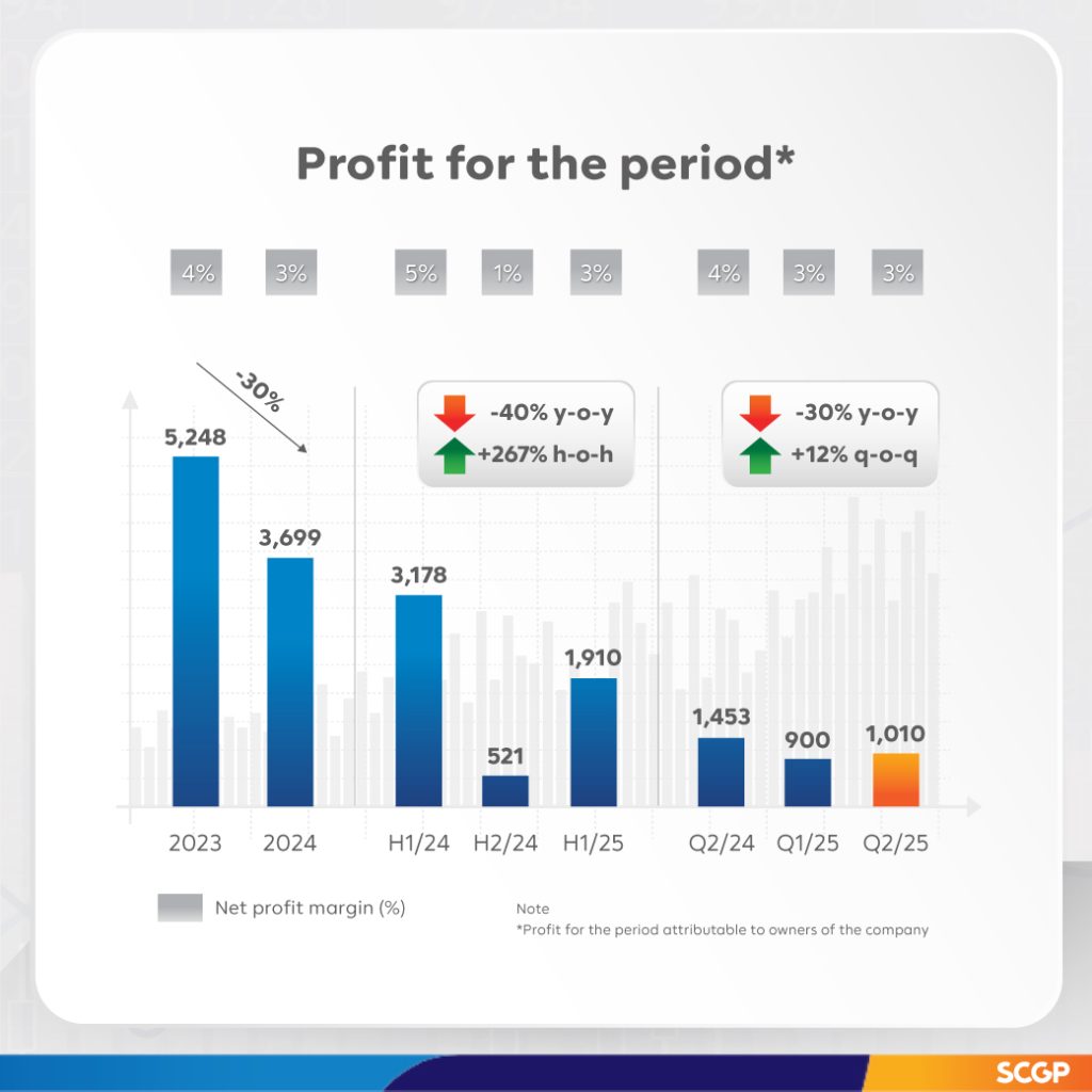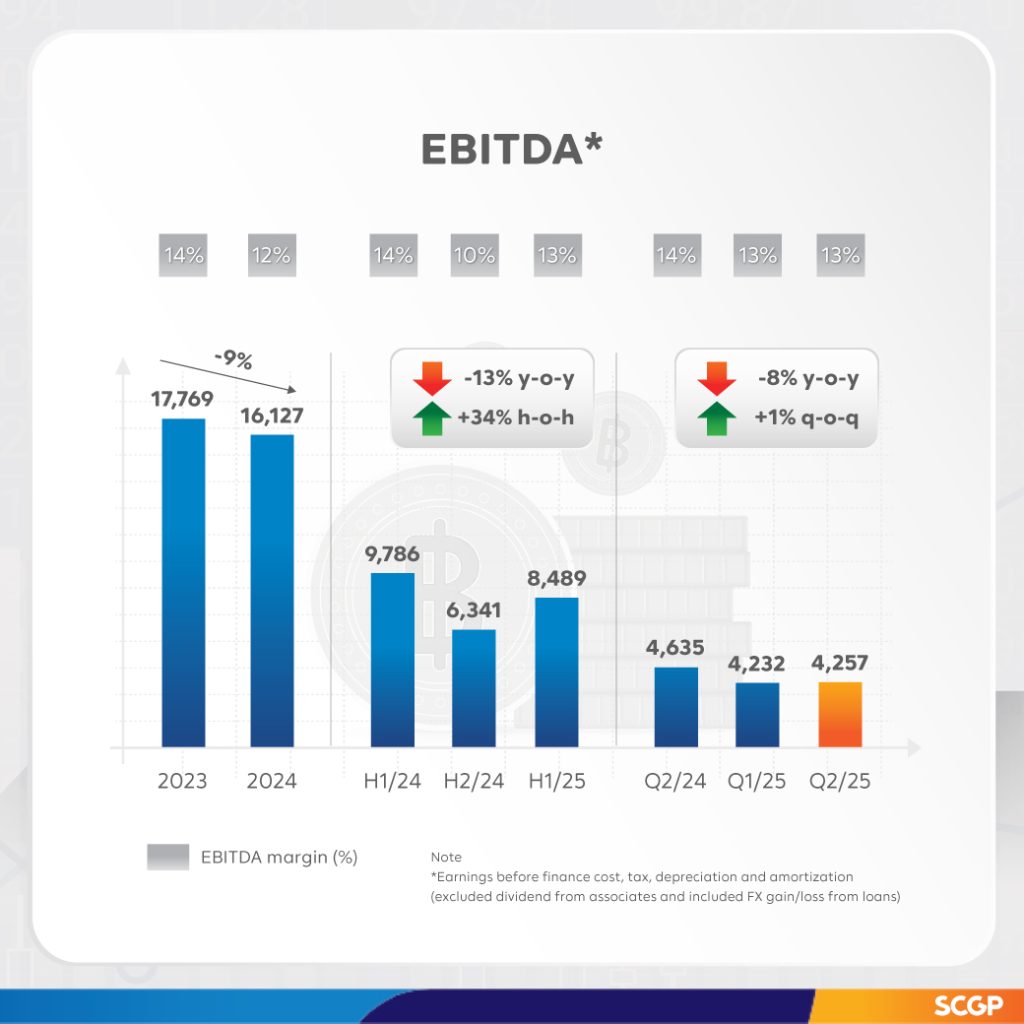 ทั้งนี้โดย SCGP ได้วางกลยุทธ์เติบโตภายในประเทศอาเซียนอย่างต่อเนื่อง มุ่งเน้นการตลาดเชิงรุกผ่านโซลูชันบรรจุภัณฑ์ที่ตอบโจทย์ผู้บริโภค ส่งผลให้ปริมาณการขายสินค้ากลุ่มธุรกิจบรรจุภัณฑ์ครบวงจร โดยเฉพาะในเวียดนามเพิ่มขึ้นต่อเนื่อง แม้ราคาส่วนใหญ่ยังทรงตัว ส่วนกลุ่มธุรกิจเยื่อและกระดาษ ปริมาณการขายลดลงจากความต้องการที่ชะลอตัวในกลุ่มอุตสาหกรรมสิ่งทอและเครื่องนุ่งห่ม ขณะเดียวกัน บริษัทฯ ได้เน้นบริหารต้นทุนอย่างมีประสิทธิภาพและยั่งยืน ด้วยการใช้ AI และ Machine Learning ตลอดทั้งห่วงโซ่คุณค่า โดยเฉพาะธุรกิจในอินโดนีเซียที่เริ่มนำ AI มาปรับใช้ และปรับสัดส่วนการใช้พลังงาน รวมถึงเพิ่มการใช้วัตถุดิบกระดาษรีไซเคิล (RCP) ภายในประเทศ และบริหารต้นทุนทางการเงินอย่างมีประสิทธิภาพ ทำให้ EBITDA ถึงจุดคุ้มทุนตามเป้าหมาย และส่งผลดีต่อภาพรวมผลการดำเนินงานของบริษัทฯ ทำให้ในไตรมาส 2 ปี 2568 SCGP มีรายได้จากการขาย 31,557 ล้านบาท ลดลงร้อยละ 2 EBITDA 4,257 ล้านบาท เพิ่มขึ้นร้อยละ 1 และกำไรสำหรับงวด 1,010 ล้านบาท เพิ่มขึ้นร้อยละ 12 เมื่อเทียบกับไตรมาส 1 ปี 2568