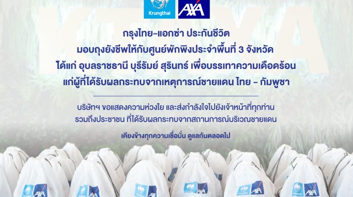 บมจ.กรุงไทย-แอกซ่า ประกันชีวิต ส่งมอบถุงยังชีพจำนวน 300 ชุด เพื่อช่วยเหลือประชาชนที่ได้รับผลกระทบจากสถานการณ์ชายแดนไทย-กัมพูชา โดยถุงยังชีพจะถูกส่งมอบให้ประชาชนผ่านศูนย์พักพิงประจำพื้นที่ 3 จังหวัด ได้แก่ จังหวัดอุบลราชธานี จังหวัดบุรีรัมย์และจังหวัดสุรินทร์ โดยทางบริษัทฯ ขอแสดงความห่วงใย และส่งกำลังใจไปยังเจ้าหน้าที่ทุกท่าน รวมถึงประชาชน ที่ได้รับผลกระทบจากสถานการณ์บริเวณชายแดน ทั้งนี้บริษัทฯ มุ่งมั่น เคียงข้างทุกความเชื่อมั่น ดูแลกันตลอดไป