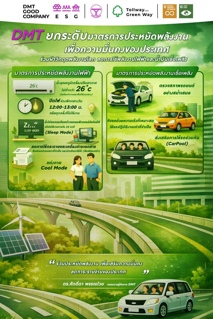 ดร.ศักดิ์ดา พรรณไวย กรรมการผู้จัดการ บริษัท ทางยกระดับดอนเมือง จำกัด (มหาชน) หรือ DMT เปิดเผยว่า จากสถานการณ์ความไม่สงบในภูมิภาคตะวันออกกลาง ซึ่งอาจส่งผลกระทบต่อเสถียรภาพด้านพลังงานโลกและประเทศไทย    บริษัทฯ จึงได้ยกระดับมาตรการลดการใช้พลังงานไฟฟ้าและน้ำมันเชื้อเพลิง เพื่อสนับสนุนนโยบายของภาครัฐและร่วมลดผลกระทบต่อความมั่นคงทางพลังานของประเทศ