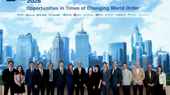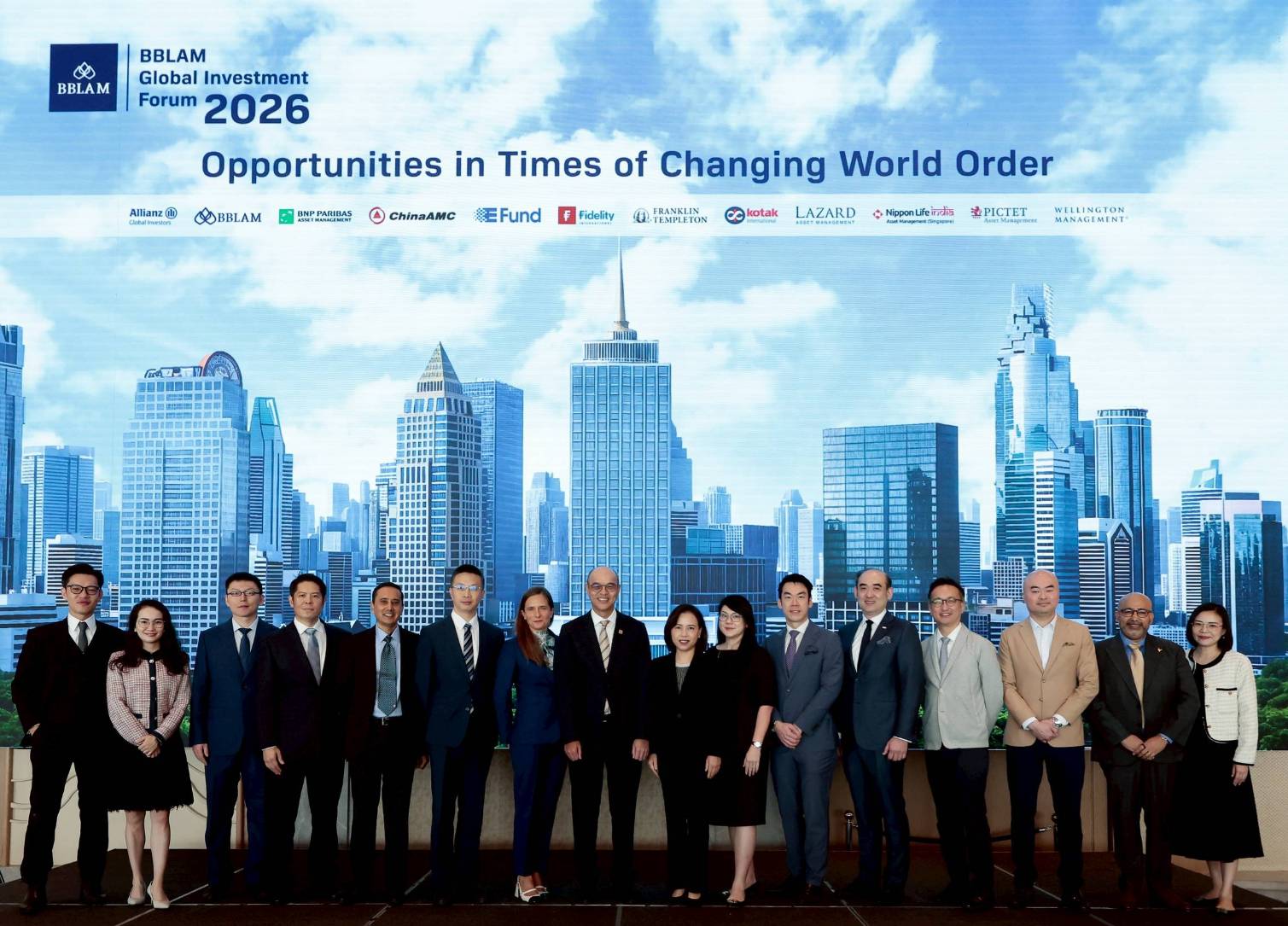 นายบรรณรงค์ พิชญากร (คนที่ 8 จากซ้าย) ประธานเจ้าหน้าที่บริหาร พร้อมด้วย ดร.ธนาวุฒิ พรโรจนางกูร (คนที่ 4 จากซ้าย) ประธานเจ้าหน้าที่การลงทุน บริษัทหลักทรัพย์จัดการกองทุนรวม บัวหลวง จำกัด หรือ BBLAM ให้การต้อนรับ นางสาว วรพร วิทยะสิรินันท์ (คนที่ 8 จากขวา) ผู้ช่วยผู้จัดการใหญ่ Wealth & Private Bank ธนาคารกรุงเทพ จำกัด (มหาชน) และทีมผู้เชี่ยวชาญการลงทุน จาก 11 บริษัทจัดการกองทุนระดับโลก ที่ให้เกียรติเข้าร่วมถ่ายทอดแนวโน้มเศรษฐกิจมหภาค ภูมิรัฐศาสตร์ และโอกาสใหม่ของการลงทุนในปี 2026 แก่นักลงทุนไทย ภายในงานฟอรั่มประจำปี “BBLAM Global Investment Forum 2026” ซึ่งจัดขึ้น ณ รร.ดุสิตธานี กรุงเทพฯ เมื่อเร็วๆนี้