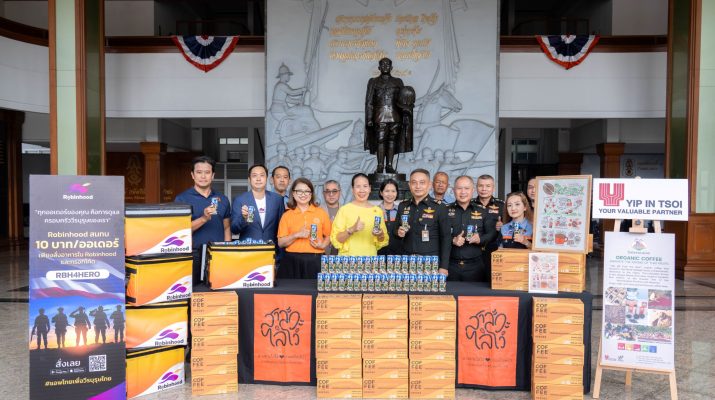 คุณมรกต ยิบอินซอย กรรมการผู้จัดการใหญ่และประธานเจ้าหน้าที่บริหาร (ที่ 3 จากซ้าย) คุณแววรัตน์ ชำนาญภักดี ผู้อำนวยการสายงานทรัพยากรบุคคลและสื่อสารองค์กร (ที่ 2 จากซ้าย) บริษัท ยิบอินซอย จำกัด พร้อมทั้งผู้บริหาร คุณพงศ์ปณต อิงคสิทธิ์ ประธานเจ้าหน้าที่บริหารฝ่ายธุรกิจ Chief Commercial Officer (CCO) (ซ้ายสุด) โรบินฮู้ด เดลิเวอรี่ มอบกาแฟกระป๋องพร้อมดื่ม “กาแฟรักษ์ป่า” สาละวะไล่โว่ ซึ่งเป็นโครงการอันเนื่องมาจากพระราชดำริในรัชกาลที่ 9
