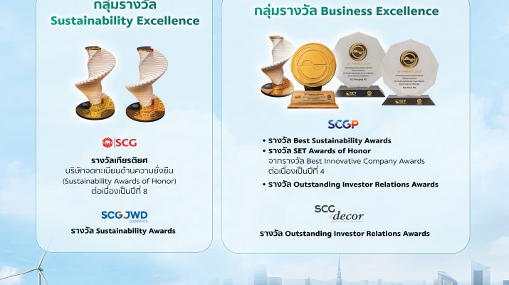 เอสซีจีได้รับรางวัลเกียรติยศ “Sustainability Excellence” ต่อเนื่องเป็นปีที่ 8 ในงาน SET AWARDS 2025 ซึ่งจัดโดยตลาดหลักทรัพย์แห่งประเทศไทย ร่วมกับวารสารการเงินธนาคาร พร้อมบริษัทใน เครือ ได้แก่ SCGP, SCGD และ SCGJWDรวม 5 รางวัลใหญ่ ในกลุ่มรางวัล Sustainability Excellence และกลุ่มรางวัล Business Excellence สะท้อนความมุ่งมั่น สร้างสรรค์นวัตกรรม และความเข้มแข็งด้านการพัฒนาความยั่งยืนขององค์กร เอสซีจี โดย นายวชิระชัย คูนำวัฒนา Deputy Chief Sustainability Officer เอสซีจี รับรางวัลเกียรติยศ บริษัทจดทะเบียนด้านความยั่งยืน (Sustainability Awards of Honor) ซึ่งมอบให้บริษัทที่ได้รับรางวัลด้านความยั่งยืนยอดเยี่ยมติดต่อกันตั้งแต่ 3 ปีขึ้นไป โดยเอสซีจีเป็นเพียงรายเดียวที่ได้รับรางวัล Sustainability Excellence ต่อเนื่องเป็นปีที่ 8 ในโอกาสที่รางวัลด้านความยั่งยืนจัดครบ 10 ปี ทั้งยังเป็นองค์กรที่เข้าร่วมตั้งแต่ปีแรกและได้รับรางวัล Best Sustainability มาอย่างต่อเนื่องทุกปี ขณะที่ บริษัท เอสซีจี เจดับเบิ้ลยูดีโลจิสติกส์ จำกัด (มหาชน) หรือ SCGJWD ได้รับรางวัล Sustainability Awards กลุ่มรางวัล Sustainability Excellence ในกลุ่มบริษัท จดทะเบียนที่มีมูลค่าหลักทรัพย์ตามราคาตลาด สูงกว่า 10,000 ล้านบาท แต่ไม่เกิน 30,000 ล้านบาท ด้าน บริษัทเอสซีจี แพคเกจจิ้ง จำกัด (มหาชน) หรือ SCGP ได้รับ 3 รางวัล ได้แก่ รางวัล Best