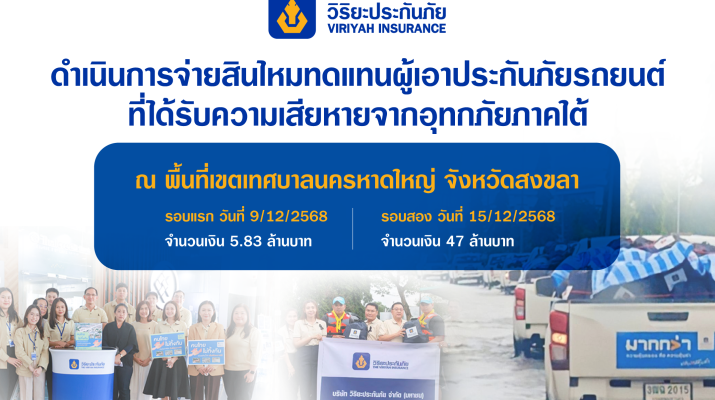 วิริยะประกันภัย เดินหน้ามาตรการเยียวยาผู้ประสบอุทกภัยภาคใต้ พร้อมเร่งดำเนินการจ่ายสินไหมทดแทนผู้เอาประกันภัยรถยนต์ที่ได้รับความเสียหายจากภัยน้ำท่วม เผยรอบแรกเมื่อวันที่ 9 ธันวาคม 68 และยังคงจ่ายคืนทุนประกันต่อเนื่องกว่า 52 ล้านบาท พร้อมจัดทัพวิริยะจิตอาสาลงพื้นที่มอบถุงยังชีพช่วยบรรเทาความเดือดร้อนผู้ประสบภัยอย่างต่อเนื่อง นายณัฐพงศ์ บุญเย็น ผู้ช่วยกรรมการผู้จัดการ บริษัท วิริยะประกันภัย จำกัด (มหาชน) เปิดเผยว่า หลังจากที่สถานการณ์อุทกภัยในพื้นที่เขตเทศบาลนครหาดใหญ่ จังหวัดสงขลา คลี่คลายลงและอยู่ระหว่างการฟื้นฟูเพื่อให้กลับสู่สภาวะปกติ รวมถึงอีกหลายพื้นที่ในจังหวัดทางภาคใต้ตอนล่างที่ระดับน้ำลดลงแล้ว แต่ยังมีบางพื้นที่ที่ยังคงมีน้ำท่วมขัง