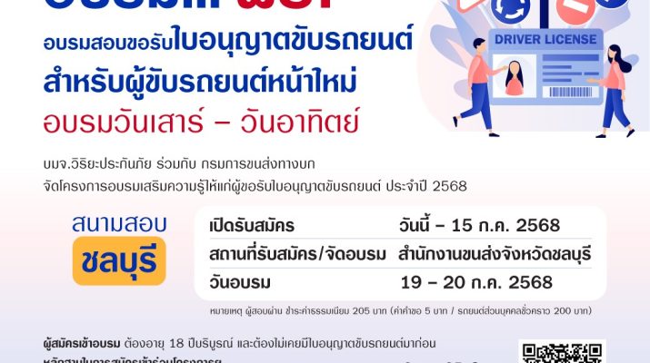 เปิดรับสมัครแล้ว ! โครงการ “อบรมเสริมความรู้ผู้ขอรับใบอนุญาตขับรถยนต์” รอบภูมิภาค รุ่นที่ 162 โดย บมจ.วิริยะประกันภัย ร่วมกับ กรมการขนส่งทางบก เปิดโอกาสให้นักขับขี่มือใหม่ และประชาชนทั่วไปที่ยังไม่เคยมีใบอนุญาตขับรถยนต์ เข้าร่วมการอบรมความรู้การขับขี่อย่างปลอดภัย พร้อมสอบขอรับใบอนุญาตขับรถยนต์ได้ทันที ในวันที่ 19 – 20 ก.ค. 2568 ณ สำนักงานขนส่งจังหวัดชลบุรี ผู้สนใจสมัครเข้าร่วมโครงการฯ