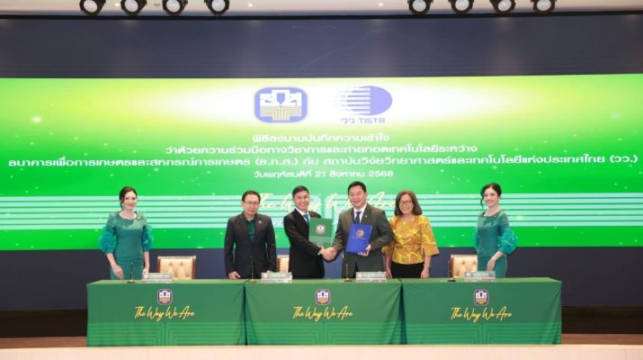 ธนาคารเพื่อการเกษตรและสหกรณ์การเกษตร (ธ.ก.ส.) ร่วมกับ สถาบันวิจัย วิทยาศาสตร์และเทคโนโลยีแห่งประเทศไทย (วว.) ลงนามบันทึกความเข้าใจ (MOU) ว่าด้วยความร่วมมือทาง วิชาการและถ่ายทอดเทคโนโลยี เพื่อร่วมกันบูรณาการและถ่ายทอดองค์ความรู้ในด้านวิทยาศาสตร์ เทคโนโลยี นวัตกรรม ในการเพิ่มศักยภาพและความสามารถในการแข่งขันของเกษตรกรและผู้ประกอบธุรกิจในภาค การเกษตร โดยเฉพาะเกษตรกรรุ่นใหม่ ให้สามารถนำความรู้ไปใช้ประโยชน์ในการผลิต การแปรรูป การเพิ่ม ผลผลิต การตลาด ป้องกันบรรเทาปัญหาของเกษตรกร และการสร้างมูลค่าเพิ่มแก่ผลผลิตทางการเกษตร ส่งเสริม ให้เกษตรกรใช้ประโยชน์จากงานบริการด้านวิทยาศาสตร์ และเทคโนโลยี รวมถึงการรับรองมาตรฐานการผลิต เพื่อสร้างความเข้มแข็งให้แก่เกษตรกรในการประกอบอาชีพเกษตรกรรมได้อย่างมั่งคงและยั่งยืน ซึ่ง ธ.ก.ส. จะสนับสนุนด้านการเข้าถึงแหล่งเงินทุน บริการทางการเงิน