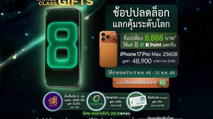 บัตรเครดิตกสิกรไทย จัดเต็มให้ลูกค้ารับความคุ้มครั้งใหม่กับแคมเปญ Special WORLD CLASS GIFTS: ช้อปปลดล็อก แลกคุ้มระดับโลก* จัดโปรโมชั่นพิเศษ เพียงลงทะเบียนก่อนใช้จ่ายผ่าน K PLUS และใช้จ่ายสะสมผ่านบัตรเครดิตกสิกรไทย ครบ 8,888 บาท* ในหมวดสินค้าที่ร่วมรายการ ระหว่างวันที่ 9 ตุลาคม 2568 – 31 ตุลาคม