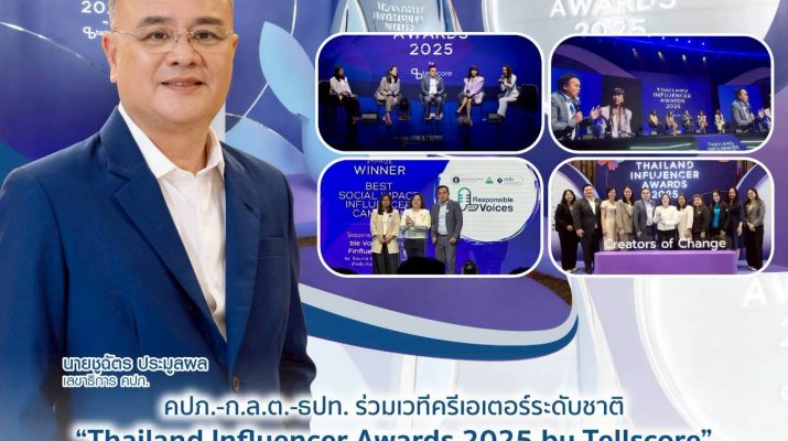 สำนักงานคณะกรรมการกำกับและส่งเสริมการประกอบธุรกิจประกันภัย (สำนักงาน คปภ.)โดย นายชูฉัตร ประมูลผล เลขาธิการ คปภ. มอบหมายให้นายเจษฎา วรรณเขจร ผู้อำนวยการกลุ่มงานสื่อสารองค์กร เป็นผู้แทนสำนักงาน คปภ. เข้าร่วมงาน “Thailand Influencer Awards 2025 by Tellscore” ซึ่งจัดโดย บริษัท เทลสกอร์ จำกัด ผู้นำด้านแพลตฟอร์ม