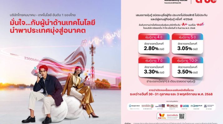 บริษัท ทรู คอร์ปอเรชั่น จำกัด (มหาชน) (“บริษัทฯ”) บริษัทโทรคมนาคมเทคโนโลยีชั้นนำของไทย และอันดับ 1 ของโลกด้านความยั่งยืน ด้วยคะแนน DJSI 2024 สูงสุดในกลุ่มอุตสาหกรรมโทรคมนาคมต่อเนื่องเป็นปีที่ 7 พร้อมเดินหน้าสู่อนาคตอย่างมั่นคง เตรียมเสนอขายหุ้นกู้ชุดใหม่ให้แก่ผู้ลงทุนทั่วไป จำนวน 4 ชุด อายุตั้งแต่ 4 ปีถึง 10