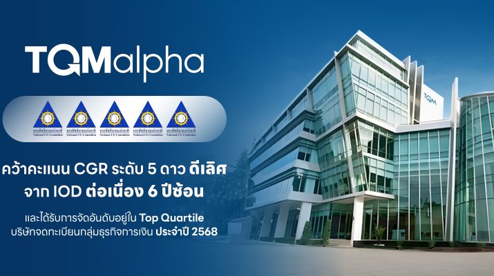 บริษัท ทีคิวเอ็ม อัลฟา จำกัด (มหาชน) หรือ TQMalpha ได้รับคะแนนประเมินการกำกับดูแลกิจการอยู่ในระดับ “ดีเลิศ” (Excellent CG Scoring) ต่อเนื่องเป็นปีที่ 6 จากสมาคมส่งเสริมสถาบันกรรมการบริษัทไทย (IOD) ภายใต้การสนับสนุนของตลาดหลักทรัพย์แห่งประเทศไทย (SET) ซึ่งจัดทำรายงานการประเมินการกำกับดูแลกิจการของบริษัท จดทะเบียนไทย ประจำปี 2568 (Corporate Governance