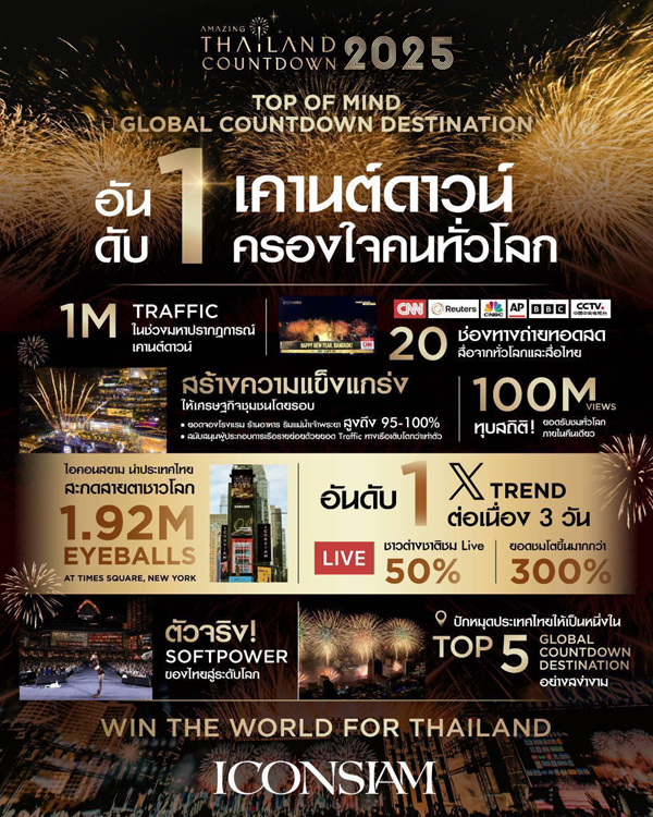ที่หนึ่งในใจผู้คน : Amazing Thailand Countdown 2025 ที่ไอคอนสยาม เกิดขึ้นจากการทุ่มทุน และสรรพกำลัง เพื่อสร้างมหาปรากฏการณ์ โดยความร่วมมือกับกองทัพศิลปินไทยและศิลปินระดับโลก และพันธมิตรชั้นนำ เชื่อมโยงหัวใจคนไทยและสายตานานาชาติ ส่งมอบความสุขผ่านเสียงเพลง และความสว่างไสวจากพลุริมแม่น้ำเจ้าพระยา ค่ำคืนอันงดงามนี้กลายเป็นความทรงจำของผู้คนหลายล้านคนทั่วโลก ทำให้คนไทยก้าวเข้าสู่ปีใหม่ด้วยความภาคภูมิใจ ว่าประเทศเราไม่เป็นที่สองรองใคร การเฉลิมฉลองสุดยิ่งใหญ่นี้ยังถูกถ่ายทอดผ่านจอไทม์สแควร์ ใจกลางมหานครนิวยอร์ก และอีกกว่า 50 ล้านคนที่ชมผ่านการถ่ายทอดสดไปทั่วทุกมุมโลก กว่า 20 ช่องทาง รวมถึง CNN, BBC, AP, AFP, Reuters, CNBC, ABC,CCTV, South China Morning Post, MBN TV และ Live Streaming ทำให้มียอดวิวผ่านสื่อออนไลน์กว่า 100 ล้านวิว จากทุกแพลตฟอร์ม กลายเป็นกระแสบนโซเชียลมีเดียติดอันดับโลก เป็นที่กล่าวขวัญและสร้างความประทับใจสูงสุดแก่ผู้คนที่ร่วมชมจากทุกช่องทางทั่วโลก