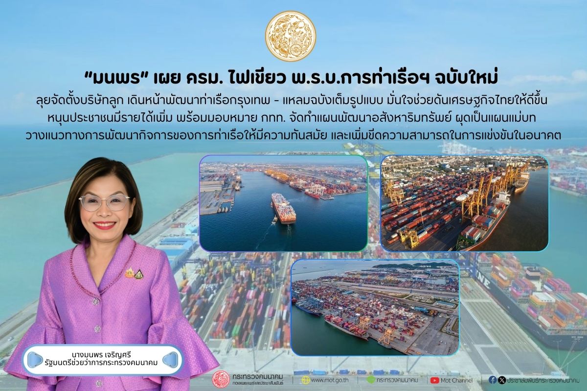 “มนพร” เผย ครม. ไฟเขียว พ.ร.บ.การท่าเรือฯ ฉบับใหม่ ลุยจัดตั้งบริษัทลูก เดินหน้าพัฒนาท่าเรือกรุงเทพ-แหลมฉบังเต็มรูปแบบ มั่นใจช่วยดันเศรษฐกิจไทยให้ดีขึ้น หนุนประชาชนมีรายได้เพิ่ม พร้อมมอบหมาย กทท. จัดทำแผนพัฒนาอสังหาริมทรัพย์ ผุดเป็นแผนแม่บท วางแนวทางการพัฒนากิจการของการท่าเรือให้มีความทันสมัยและเพิ่มขีดความสามารถในการแข่งขันในอนาคต