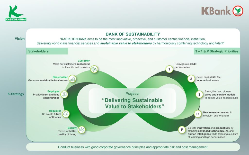 ธนาคารยังวางรากฐาน ยุทธศาสตร์ +1 เพื่อสร้างรายได้ใหม่ในระยะกลางและระยะยาว ได้แก่ การดำเนินงานของ บริษัท กสิกร อินเวสเจอร์ จำกัด (KIV) ให้บริการแก่ลูกค้ารายย่อย ด้วยความร่วมมือกับพันธมิตรในระบบนิเวศ ควบคู่กับการให้ความสําคัญกับคุณภาพสินทรัพย์ สําหรับการขยายธุรกิจในระดับภูมิภาค ธนาคารให้ความสําคัญกับภูมิภาค AEC+3 โดยเฉพาะการเติบโตในตลาดที่มีศักยภาพ ในประเทศจีน เวียดนาม และอินโดนีเซีย นอกจากนี้ ธนาคารยังได้ยกระดับการให้บริการทางการเงินด้วยนวัตกรรมผ่านการทำงานในระบบนิเวศและการสร้างนวัตกรรม ด้วยการเปิดตัว 4 ใบอนุญาตในธุรกิจสินทรัพย์ดิจิทัล อีกทั้งธนาคารยังสนับสนุนการขับเคลื่อนธุรกิจของลูกค้าไปสู่การปล่อยก๊าซเรือนกระจกสุทธิเป็นศูนย์ ผ่านการจัดตั้งบริษัท คอปฟิฟตี้ จำกัด (KOP50) บริษัทโฮลดิ้งภายใต้กลุ่มธุรกิจทางการเงินของธนาคาร เพื่อริเริ่มโครงการสร้าง Sustainable Ecosystem ที่สมบูรณ์ มีนวัตกรรมใหม่ ๆ จาก กสิกร บิซิเนส-เทคโนโลยี กรุ๊ป รวมทั้ง ระหว่างปี 2565-2567 ธนาคารได้ส่งมอบเงินให้สินเชื่อและเงินลงทุนด้านความยั่งยืนจำนวนกว่า 1.2 แสนล้านบาท