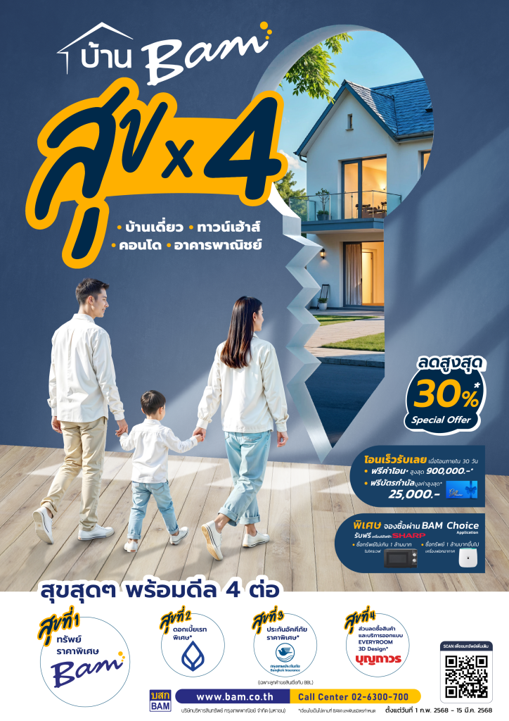 BAM จัดแคมเปญ “บ้าน BAM สุข x 4 ” คัดที่อยู่อาศัยทั่วประเทศกว่า 2,300 รายการ นำมาลดราคาสูงสุด 30 % ตั้งแต่วันนี้ ถึงวันที่ 15 มีนาคม 2568 พร้อมรับโปร “ โอนเร็ว รับเลย ” ฟรีค่าโอนสูงสุด 900,000 บาทต่อรายการทรัพย์ และรับบัตรกำนัลมูลค่าสูงสุด 25,000 บาท พิเศษจองซื้อทรัพย์ ผ่านช่องทาง Online : BAM Choice Application รับฟรีเครื่องใช้ไฟฟ้า SHARP