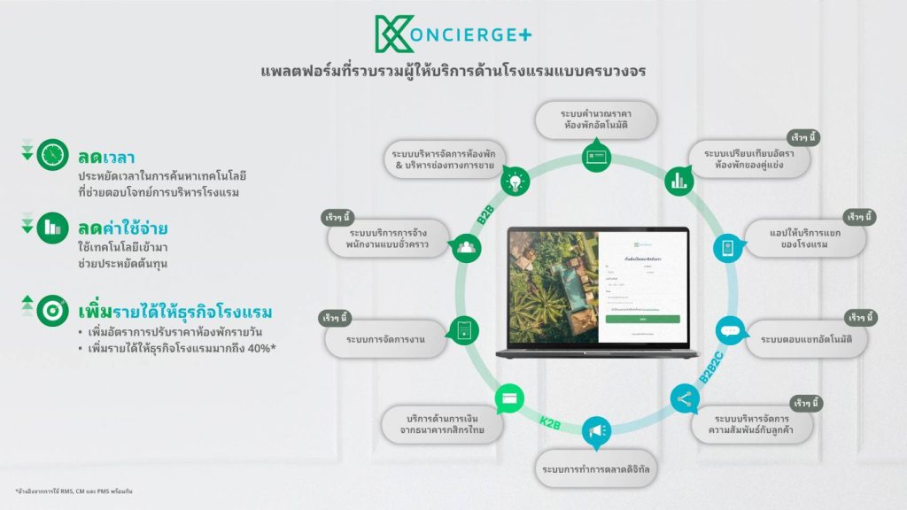 ธนาคารกสิกรไทย เปิดตัว “คอนเซียชพลัส” (KONCIERGE+) แพลตฟอร์มแรกที่รวมโซลูชันเพื่อธุรกิจโรงแรมแบบครบวงจร สนับสนุนให้ธุรกิจโรงแรม เพิ่มรายได้ลดรายจ่าย เพื่อให้เข้าถึงเทคโนโลยีในการบริหารจัดการโรงแรมได้ง่ายขึ้น ด้วยโซลูชันที่รวมมาให้ครบ ได้แก่ ระบบการบริหารจัดการห้องพัก ระบบการบริหารช่องทางการขายและการตั้งราคา ระบบการบริหารจัดการประสบการณ์ลูกค้า นอกจากนี้ยังเป็นการเพิ่มศักยภาพในการแข่งขันรับโอกาสการเติบโตของธุรกิจท่องเที่ยวไทย เพราะประเทศไทยเป็นหนึ่งในแลนด์มาร์คสำคัญของนักท่องเที่ยวต่างชาติ โดยปี 2568 คาดว่าจะมีนักท่องเที่ยวต่างชาติเที่ยวไทยจำนวน 37.5 ล้านคน