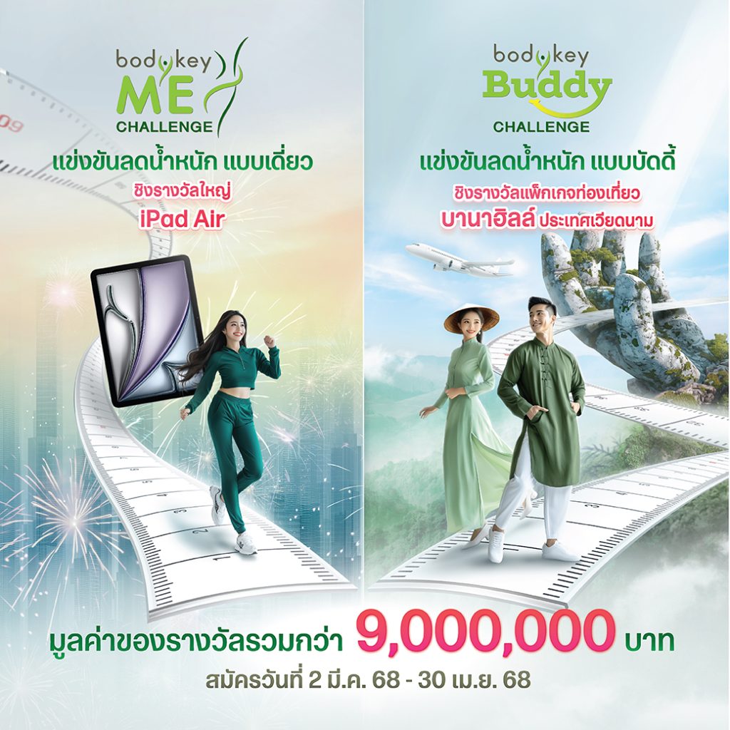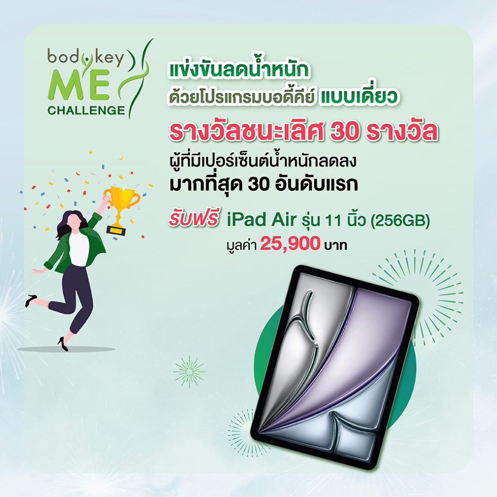 - เริ่มต้นด้วย “BodyKey ME Challenge” การแข่งขันลดน้ำหนักด้วยโปรแกรมบอดี้คีย์แบบเดี่ยว โดยผู้ที่มีเปอร์เซ็นต์น้ำหนักลดลงมากที่สุด 30 อันดับแรก ร่วมรับรางวัลใหญ่ iPad Air มูลค่า 25,900 บาท