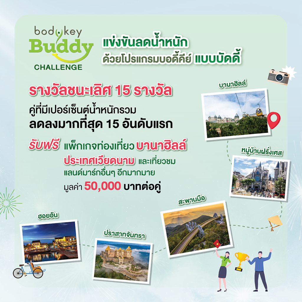 - ความท้าทายครั้งใหม่ กับ “BodyKey Buddy Challenge” การแข่งขันลดน้ำหนักด้วยโปรแกรมบอดี้คีย์แบบบัดดี้ เป็นครั้งแรกของการแข่งขันแบบคู่ โดยคู่บัดดี้ที่มีเปอร์เซ็นต์น้ำหนักลดลงรวมกันมากที่สุด 15 คู่ร่วมรับรางวัลใหญ่แพ็กเกจท่องเที่ยวบานาฮิลล์ ประเทศเวียดนาม มูลค่า 50,000 บาท (ต่อคู่)