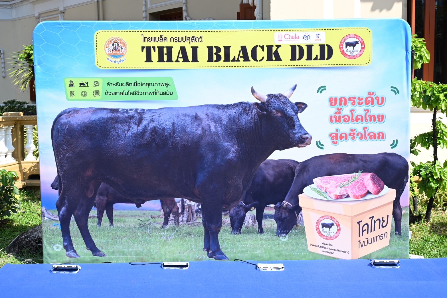“โครงการนี้ ได้รับการสนับสนุนจากสำนักงานพัฒนาการวิจัยการเกษตร (องค์การมหาชน) และคณะสัตวแพทยศาสตร์ จุฬาลงกรณ์มหาวิทยาลัย ซึ่งมีบทบาทสำคัญในการสนับสนุนการวิจัยและพัฒนเทคโนโลยีการปรับปรุงพันธุ์โคเนื้อ ภายใต้ชื่อ “โครงการการสร้างโคเนื้อพันธุ์ไทยแบล็คสำหรับผลิตเนื้อโคคุณภาพสูงด้วยเทคโนโลยีชีวภาพที่ทันสมัย” “ไทยแบล็ค DLD” ถือเป็นความสำเร็จของการนำนวัตกรรมและเทคโนโลยีมาพัฒนาสายพันธุ์โคเนื้อของไทย เพื่อสร้างผลิตภัณฑ์เนื้อโคคุณภาพสูงที่ตอบโจทย์ความต้องการของตลาดทั้งในและต่างประเทศ การพัฒนาสายพันธุ์นี้ไม่เพียงช่วยเพิ่มรายได้ให้กับเกษตรกร แต่ยังช่วยลดการนำเข้าเนื้อโคจากต่างประเทศ และสร้างความมั่นคงทางเศรษฐกิจให้กับประเทศในระยะยาว ถือเป็นอีกหนึ่งความภาคภูมิใจของประเทศไทยในการสร้างสายพันธุ์โคเนื้อ ที่สามารถแข่งขันได้ในตลาดโลก และเป็นทางเลือกใหม่สำหรับผู้บริโภคที่ชื่นชอบเนื้อโคเกรดพรีเมียม ขณะนี้กรมปศุสัตว์ ได้เตรียมน้ำเชื้อแช่แข็งไว้สำหรับให้บริการผสมเทียมให้กับเกษตรกรที่สนใจ โดยสามารถติดต่อได้ที่ศูนย์วิจัยการผสมเทียมและเทคโนโลยีชีวภาพทั่วประเทศ สำหรับช่องทางการจำหน่ายเนื้อหรือผลิตภัณฑ์แปรรูปจากโคไทยแบล็ค DLD จะมีจำหน่ายที่ร้านค้าสวัสดิการกรมปศุสัตว์” อธิบดีกรมปศุสัตว์กล่าวปิดท้าย