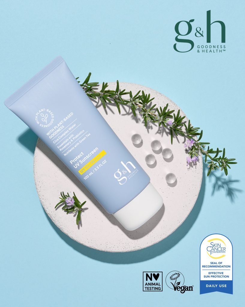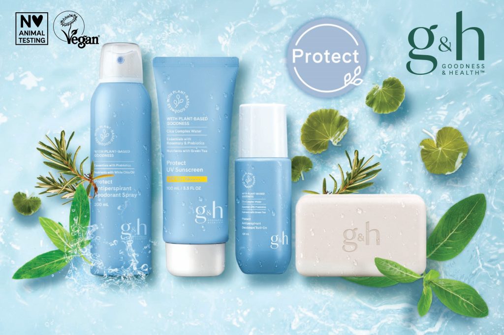 จีแอนด์เอช กู๊ดเนส แอนด์ เฮลท์ โพรเท็คท์ ลูกกลิ้งระงับเหงื่อและกลิ่นกาย (G&H Goodness & Health Protect Antiperspirant Deodorant Roll-On) โรลออนระงับกลิ่นกายขายดีที่สุดของ G&H ช่วยระงับเหงื่อและกลิ่นกายได้ยาวนานถึง 48 ชั่วโมง* ช่วยปลอบประโลมผิวใต้วงแขนให้เบาสบาย ไม่ทิ้งคราบเหลืองบนเสื้อผ้า อุดมส่วนผสมจากขิง ไบซาโบลอลจากพืช ช่วยลดการระคายเคืองใต้วงแขน ไม่มีส่วนผสมของแอลกอฮอล์ ใช้ง่ายเป็นสูตรแห้งเร็ว ช่วยให้คุณรู้สึกสดชื่นและแห้งสบาย จีแอนด์เอช กู๊ดเนส แอนด์ เฮลท์ โพรเท็คท์ สเปรย์ระงับเหงื่อและกลิ่นกาย (G&H Goodness & Health Protect Antiperspirant Deodorant Spray) ผลิตภัณฑ์ระงับกลิ่นกายรูปแบบสเปรย์ ช่วยระงับเหงื่อและกลิ่นกายได้ยาวนานถึง 48 ชั่วโมง** ผสานส่วนผสมชาเขียว จากฟาร์มออร์แกนิกนิวทริไลท์ ช่วยปกป้องผิวจากสารแอนตี้ ออกซิแดนท์ น้ำมันเมล็ดเชียขาว ซิกา คอมเพล็กซ์ วอเตอร์ และสารสกัดจากโรสแมรี่ ช่วยปลอบประโลมผิวใต้วงแขน ให้เบาสบาย ใช้ง่าย สะดวก และแห้งเร็ว ช่วยปกป้องความเปียกชื้นใต้วงแขน ให้ความรู้สึกสดชื่นและสะอาด จีแอนด์เอช กู๊ดเนส แอนด์ เฮลท์ โพรเท็คท์ สบู่อาบน้ำ (G&H Goodness & Health Protect Bar Soap) สบู่อาบน้ำ ช่วยทำความสะอาดผิวกายอย่างอ่อนโยน มีส่วนผสมชาเขียว จากฟาร์มออร์แกนิกนิวทริไลท์ ช่วยปกป้องผิวจากสารแอนตี้ออกซิแดนท์ สารสกัดจากโรสแมรี่ ช่วยปลอบประโลมผิว และกลีเซอรีนจากพืช ช่วยให้ความชุ่มชื้น มีส่วนช่วยลดกลิ่นกาย ขจัดคราบสิ่งสกปรก ช่วยคงความชุ่มชื้นและปรับสภาพผิวตามธรรมชาติ และไฮไลท์สำหรับซัมเมอร์นี้ จีแอนด์เอช กู๊ดเนส แอนด์ เฮลท์ ยูวี โพรเท็คท์ ยูวี ซันสกรีน (G&H Goodness & Health UV Protect UV Sunscreen) ครีมกันแดดเนื้อเบาบาง สูตรสบายผิว ซึมเร็ว สามารถปกป้องผิวจากมลภาวะที่ทำร้ายผิว และรังสียูวีบี/ยูวีเอ ด้วยค่าเอสพีเอฟสูงถึง 50+ มีส่วนผสมซิกา คอมเพล็กซ์ วอเตอร์ กลีเซอรีนจากพืช และอื่น ๆ ช่วยให้ความชุ่มชื้นและปลอบประโลมผิว ชาเขียว ช่วยปกป้องผิวจากมลภาวะที่ทำร้ายผิว และโรสแมรี่ ช่วยปลอบประโลมผิว เหมาะสำหรับทุกสภาพผิว สามารถใช้งานได้ทุกวัน อีกทั้ง ผ่านการรับรองโดยมูลนิธิโรคมะเร็งผิวหนัง หรือ Skin Cancer Foundation (SCF) องค์กรระดับโลกที่ให้ความรู้ด้านการแพทย์เกี่ยวกับการป้องกัน ตรวจหาและการรักษาโรคมะเร็งผิวหนัง การันตีส่วนผสมที่ปลอดภัยและมีประสิทธิภาพในการป้องกันความเสียหายที่อาจนำไปสู่โรคมะเร็งผิวหนัง