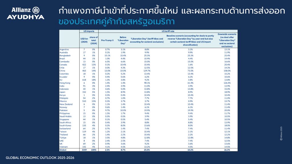 กลุ่มอลิอันซ์ เปิดเผยบทวิเคราะห์เศรษฐกิจโลกหลังนโยบายทรัมป์ ชี้ให้เห็นว่าเศรษฐกิจโลกกำลังเผชิญกับแรงกดดันที่เข้มข้นขึ้น หลังจากสหรัฐฯ ภายใต้การนำของประธานาธิบดีโดนัลด์ ทรัมป์ ในวาระที่สอง ประกาศใช้มาตรการภาษีแบบตอบโต้ (reciprocal tariffs) โดยตั้งเป้าเพิ่มภาษีนำเข้าสินค้าจากจีนสูงสุดถึง 130% ซึ่งถือเป็นระดับที่ไม่เคยมีมาก่อนนับตั้งแต่ช่วงทศวรรษ 1890 ความเคลื่อนไหวดังกล่าวส่งผลให้ต้นทุนการค้าระหว่างประเทศพุ่งสูงขึ้นทันที โดยเฉพาะในภาคยานยนต์ อุตสาหกรรมการผลิต และอิเล็กทรอนิกส์ ทั้งนี้ สหรัฐฯ ยังส่งสัญญาณว่าจะใช้มาตรการภาษีกับประเทศอื่นเพิ่มเติม เช่น กลุ่มประเทศเอเชียตะวันออกเฉียงใต้ เม็กซิโก และยุโรปตะวันออก นำไปสู่ความไม่แน่นอนทางเศรษฐกิจที่แผ่ขยายไปทั่วโลก ส่งผลให้ธนาคารกลางและนักลงทุนต่างเริ่มประเมินความเสี่ยงใหม่อีกครั้ง