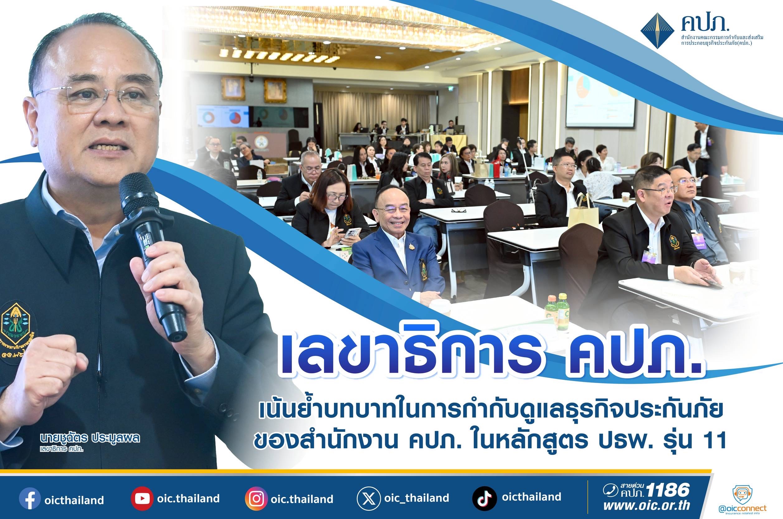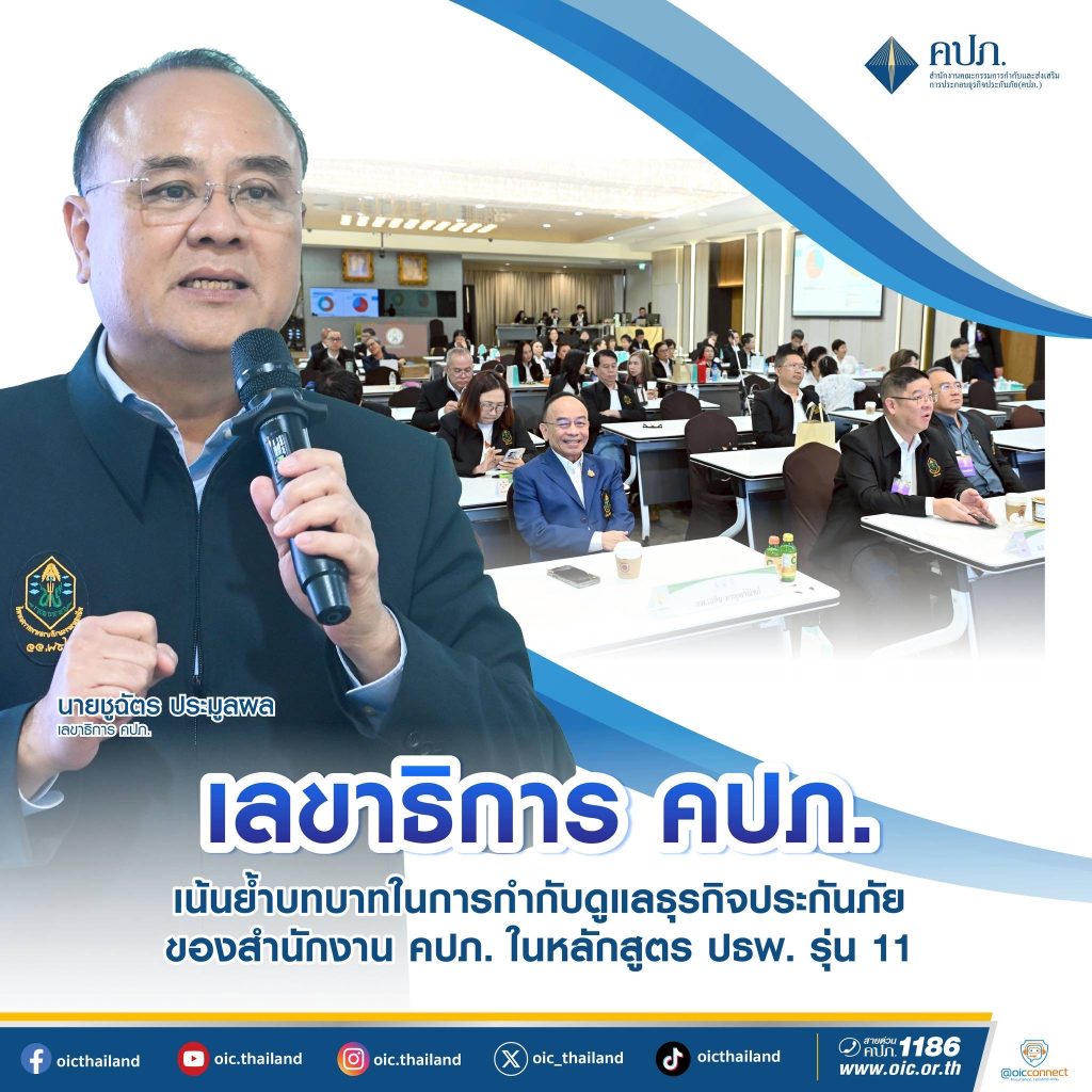 เมื่อวันที่ 26 เมษายน 2568 นายชูฉัตร ประมูลผล เลขาธิการคณะกรรมการกำกับและส่งเสริมการประกอบธุรกิจประกันภัย (เลขาธิการ คปภ.) ได้เข้าร่วมการบรรยายในหัวข้อ “การกำกับดูแลธุรกิจประกันภัย” ซึ่งจัดโดย หลักสูตรประกาศนียบัตรธรรมาภิบาลทางการแพทย์สำหรับผู้บริหารระดับสูง รุ่นที่ 11 (ปธพ. 11) ณ ห้องประชุมวชิรเวช ชั้น 14 อาคารมหิตลาธิเบศร กระทรวงสาธารณสุข เลขาธิการ คปภ. ได้กล่าวถึงภาพรวมของธุรกิจประกันภัยไทยที่มีการพัฒนาอย่างต่อเนื่อง ท่ามกลางบริบทการเปลี่ยนแปลงทั้งด้านเศรษฐกิจ สังคม และเทคโนโลยี พร้อมทั้งอธิบายบทบาทของสำนักงาน คปภ. ในการกำกับดูแลธุรกิจประกันภัย ผ่านกฎหมายและกลไกต่าง ๆ ที่มุ่งคุ้มครองสิทธิประโยชน์ของประชาชนควบคู่ไปกับการสร้างความเชื่อมั่นและส่งเสริมให้ธุรกิจประกันภัยเติบโตอย่างมั่นคง