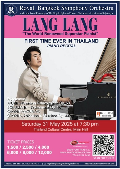 นักเปียโนระดับโลก “หลางหลาง” เตรียมเปิดการแสดงครั้งแรกในประเทศไทย โดยจะจัดการแสดงคอนเสิร์ตเดี่ยว ในวันที่ 31 พฤษภาคม 2568 ณ ศูนย์วัฒนธรรมแห่งประเทศไทย เริ่มการแสดงเวลา 19.30 น. ด้วยการแสดงเดี่ยวเปียโนในธีมวันวาเลนไทน์ การแสดงพิเศษครั้งนี้จัดขึ้นโดยมูลนิธิรอยัลแบงค์คอกซิมโฟนีออร์เคสตร้า โดยได้รับการสนับสนุนจาก บี.กริม การแสดงครั้งแรกของหลางหลางในประเทศไทยนี้ เป็นโอกาสครั้งสำคัญที่ผู้ชมจะได้สัมผัสกับความเป็นอัจฉริยะของหนึ่งในนักเปียโนที่ยิ่งใหญ่ที่สุดแห่งยุคสมัย