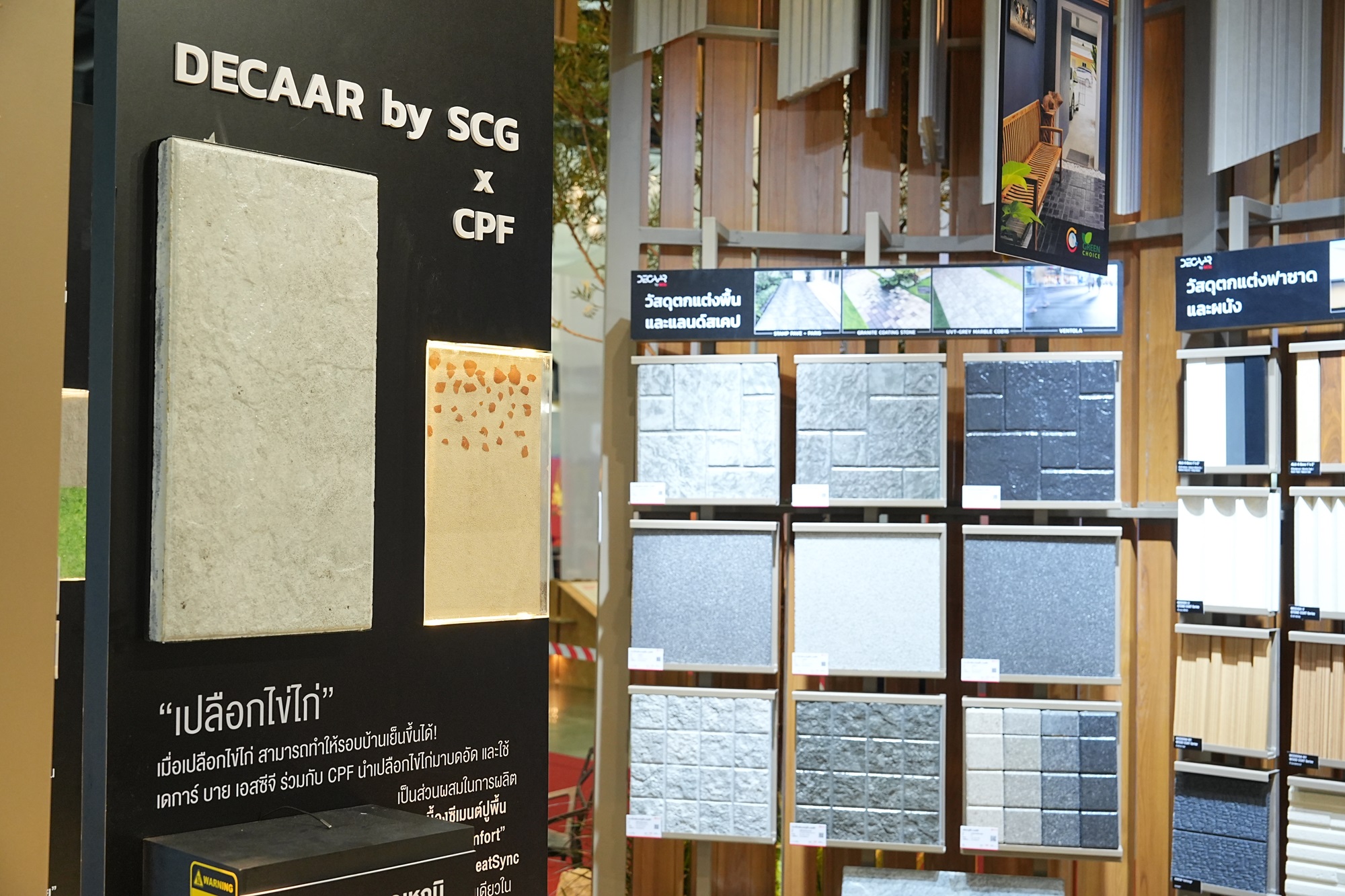 เดินหน้าพัฒนาสินค้าคุณภาพ ปลอดภัยกับผู้ใช้งานและอยู่อาศัย ไม่มีแร่ใยหิน 100% พร้อมโชว์เทคโนโลยีกันร้อน X-Shield และการเคลือบผิว Double Coating ตอบโจทย์การใช้งานที่อยู่อาศัยในเมืองร้อน นอกจากนี้ วัสดุก่อสร้าง SCG ยังช่วยลดการปล่อยก๊าซเรือนกระจกและใช้ทรัพยากรอย่างคุ้มค่า อาทิ หลังคาเอสซีจีคาร์บอนต่ำ รุ่น Excella, Prestige และ CPAC เป็นรายแรกที่ได้รับฉลากคาร์บอนฟุตพริ้นท์ กลุ่มสินค้าเอสซีจี Smart Board และไม้สังเคราะห์ ที่ได้รับรองมาตรฐาน EPD International จากองค์กรระดับโลก และ SCG Green Choice ทั้งยังเปิดตัวแบรนด์น้องใหม่ VERDI นวัตกรรมไม้จริงจากไผ่ธรรมชาติ ปล่อยคาร์บอนน้อยกว่าไม้สังเคราะห์ทั่วไปถึง 50%