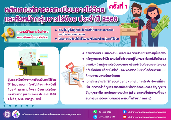 จึงขอเชิญชวนพี่น้องเกษตรกรชาวไร่อ้อยทุกท่าน มาจดทะเบียนเพื่อรักษาสิทธิประโยชน์ ทั้งนี้ สำหรับหลักฐานประกอบคำขอ ท่านสามารถเข้าไปดูรายละเอียดได้ที่เว็บไซต์ www.ocsb.go.th หรือสอบถามข้อมูลเพิ่มเติมได้ที่ 02-4306814 ต่อ 4830