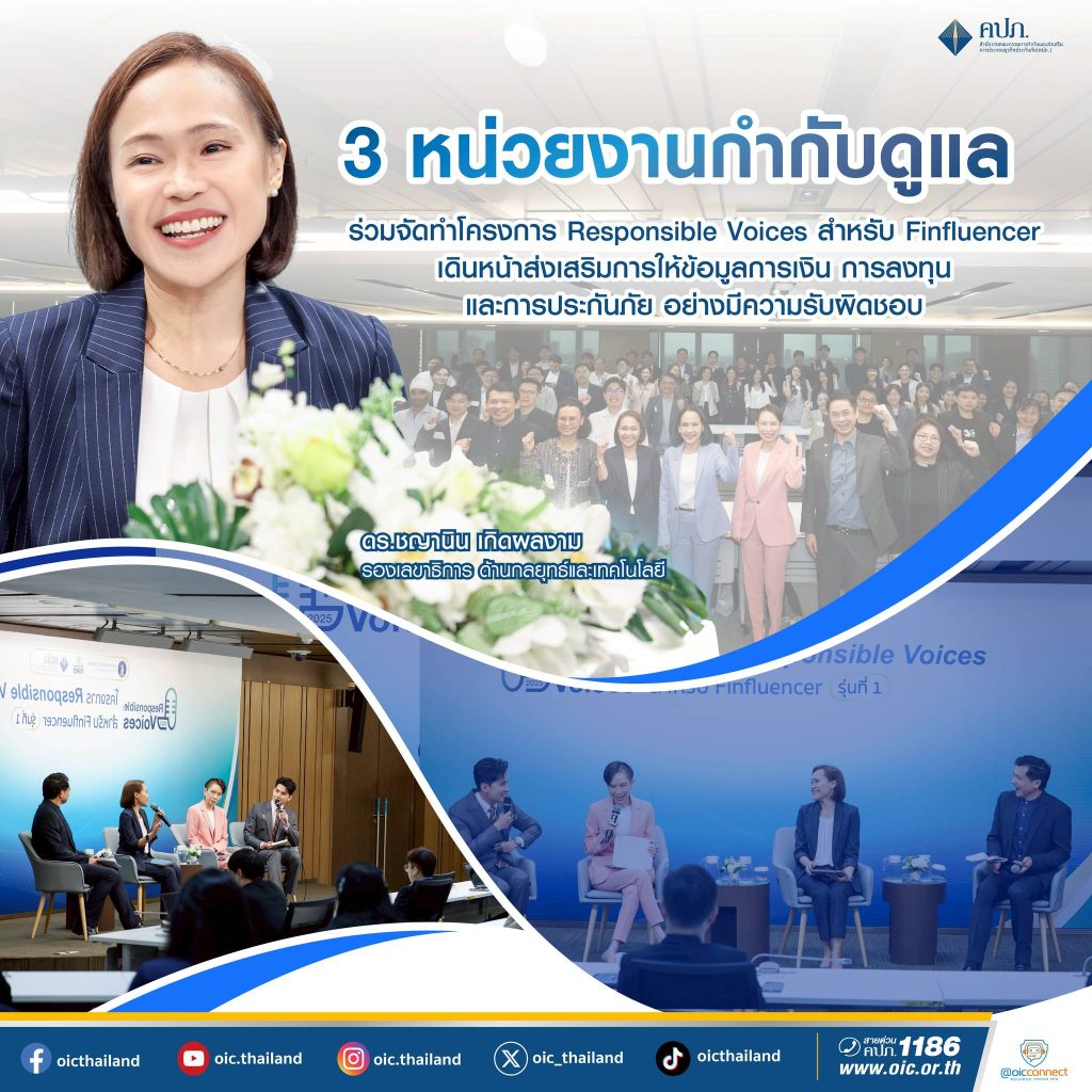สำนักงานคณะกรรมการกำกับและส่งเสริมการประกอบธุรกิจประกันภัย (สำนักงาน คปภ.) ธนาคารแห่งประเทศไทย (ธปท.) และสำนักงานคณะกรรมการกำกับหลักทรัพย์และตลาดหลักทรัพย์ (ก.ล.ต.) ร่วมกันจัดทำโครงการ “Responsible Voices สำหรับ Finfluencer” และจะร่วมกันสนับสนุนการเสริมสร้างความรู้และความเข้าใจให้แก่ฟินฟลูเอนเซอร์ภาคการเงิน การลงทุน และประกันภัย เพื่อให้เผยแพร่ข้อมูลให้แก่ผู้ติดตามได้อย่างถูกต้อง เหมาะสม และตระหนักถึงความสำคัญของการให้ข้อมูลอย่างมี ความรับผิดชอบ โดยมีผู้ได้รับคัดเลือกให้เข้าร่วมโครงการรุ่นที่ 1 เดือนพฤษภาคม 2568 จำนวน 50 ราย และจะเปิดรับสมัครรุ่นต่อไปเร็ว ๆ นี้