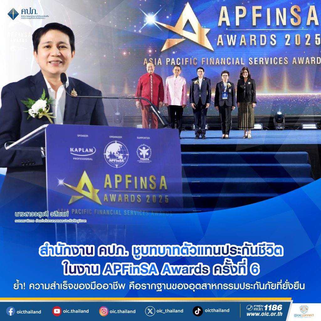 สำนักงานคณะกรรมการกำกับและส่งเสริมการประกอบธุรกิจประกันภัย (สำนักงาน คปภ.) โดย นางสาววสุมดี วสีนนท์ รองเลขาธิการ ด้านกำกับคนกลางและประกันภัยภูมิภาค ให้เกียรติเป็นประธานกล่าวเปิดงานและ มอบรางวัล APFinSA Awards ครั้งที่ 6 ณ ศูนย์การประชุมแห่งชาติสิริกิติ์ กรุงเทพมหานคร ซึ่งจัดขึ้นโดย สมาคมที่ปรึกษาการเงินแห่งเอเชียแปซิฟิก (Asia Pacific Financial Services Association หรือ APFinSA) เพื่อเชิดชูความเป็นเลิศของตัวแทนประกันชีวิตและที่ปรึกษาการเงินจากหลากหลายประเทศในภูมิภาคเอเชียแปซิฟิก โดยมีผู้แทนจากสมาคมภาคีเครือข่าย ผู้บริหารระดับสูง ในอุตสาหกรรมประกันชีวิต และแขกผู้มีเกียรติเข้าร่วมอย่างคับคั่ง สะท้อนถึงพลังของเครือข่ายวิชาชีพที่ร่วมกันผลักดัน ให้เกิดมาตรฐานและการเติบโตอย่างยั่งยืนของธุรกิจประกันภัยในระดับภูมิภาค