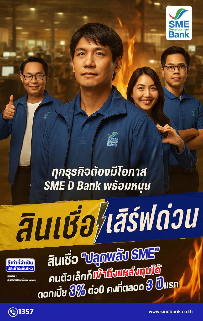 ถ้าคุณพร้อมลุย SME D Bank พร้อมหนุน เสิร์ฟด่วน! สินเชื่อ “ปลุกพลัง SME” เปิดกว้าง ผู้ประกอบการรายเล็กที่มีรายได้ต่อปีไม่เกิน 2 ล้านบาท เข้าถึงแหล่งทุน นำไปใช้ลงทุน ขยาย ปรับปรุงกิจการ หรือปรับเปลี่ยนรูปแบบการดำเนินธุรกิจ รวมถึง หมุนเวียน และเสริมสภาพคล่องในธุรกิจ วงเงินกู้ต่อรายสูงสุด 1.5 ล้านบาท อัตราดอกเบี้ยพิเศษเพียง 3%ต่อปี คงที่ตลอด 3 ปีแรก ผ่อนชำระนานสูงสุด 10 ปี ปลอดชำระหนี้เงินต้นสูงสุด 12 เดือน ไม่ต้องใช้หลักทรัพย์ค้ำประกัน