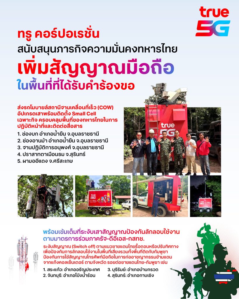 นายจักรกฤษณ์ อุไรรัตน์ หัวหน้าคณะผู้บริหารด้านกิจการองค์กร บริษัท ทรู คอร์ปอเรชั่น จำกัด (มหาชน) กล่าวว่า “เราขอสนับสนุนทหารไทยอย่างเต็มที่ในการปฏิบัติภารกิจเพื่อความมั่นคงตามแนวชายแดนไทย-กัมพูชา โดยทีมงานของเราได้รับการประสานขอสัญญาณเพิ่มจากกองทัพบก และทรู คอร์ปอเรชั่นได้ส่งทีมงานที่เข้าไปสำรวจพื้นที่ และนำรถโมบายล์สถานีฐานเคลื่อนที่เร็ว (COW) ไปติดตั้งในพื้นที่ของทหารตั้งแต่ 6 มิ.ย. ที่ผ่านมา และเพิ่มโซลูชันเพื่อประสิทธิภาพการสื่อสารให้แก่ทหารไทยในการปฏิบัติภารกิจอีกหลายจุด โดยทั้งหมดครอบคลุมเฉพาะพื้นที่ของทหารไทยที่ประจำการ และดำเนินการระงับสัญญาณมือถือตามที่เราได้ปฏิบัติตามความร่วมมือกับภาครัฐ-ดีอีเอส-กสทช. อย่างเข้มงวด เพื่อป้องกันการใช้งานสัญญาณผิดวัตถุประสงค์ และลดความเสี่ยงจากการกระทำผิดกฎหมาย เพื่อความปลอดภัยของประชาชน”