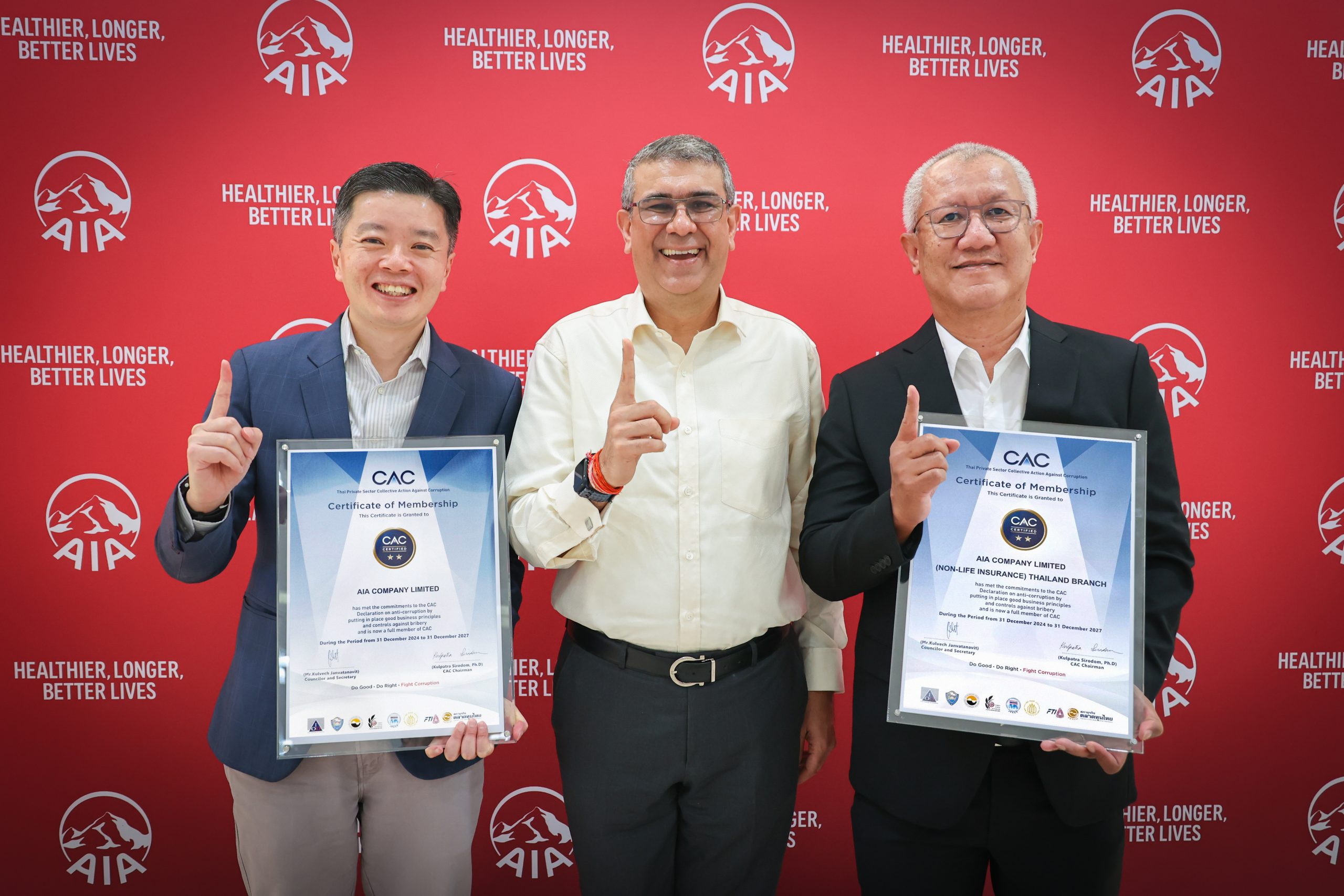 ทั้งนี้ เอไอเอ ประเทศไทย เป็นบริษัทประกันชีวิตแห่งแรกของไทยที่ได้รับการรับรองเข้าเป็นสมาชิกแนวร่วมต่อต้านคอร์รัปชันในภาคเอกชนไทย ตั้งแต่ปี 2556 และเอไอเอ ยังคงมุ่งมั่นเดินหน้าสร้างสรรค์สังคมให้เป็นสังคมคุณภาพและสนับสนุนคนไทยให้มีสุขภาพและชีวิตที่ดีขึ้นต่อไป ตามคำมั่นสัญญา ‘Healthier, Longer, Better Lives’
