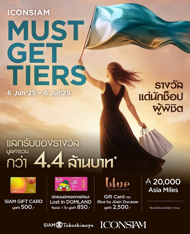 ช็อปสนุกแบบไม่มีสะดุด พร้อมแลกรับของรางวัลสุดคุ้มกับ “ICONSIAM MUST-GET-TIERS” ได้ที่ไอคอนสยาม และ สยาม ทาคาชิมายะ ตั้งแต่วันที่ 6 มิถุนายน 2568 – 6 กรกฎาคม 2568 ติดตามรายละเอียดเพิ่มเติมได้ที่ Facebook: ICONSIAM หรือโทร. 1338