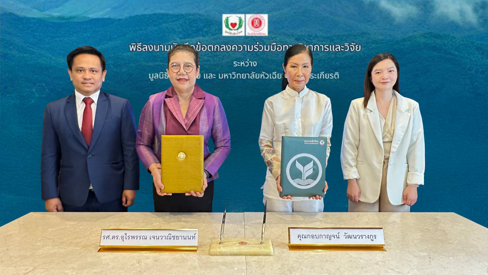 ลง MOU:นางกอบกาญจน์ วัฒนวรางกูร (ที่ 2 จากขวา) ประธานมูลนิธิกสิกรไทย และ รศ.ดร. อุไรพรรณ เจนวาณิชยานนท์ (ที่ 2 จากซ้าย) อธิการบดีมหาวิทยาลัยหัวเฉียวเฉลิมพระเกียรติ ร่วมลงนามบันทึกข้อตกลงความร่วมมือทางวิชาการและวิจัย เพื่อการพัฒนายาจากพืชและนวัตกรรมที่เกี่ยวข้อง ประกอบด้วย ผลิตภัณฑ์เพื่อส่งเสริมสุขภาพและความงาม และการพัฒนาชุดทดสอบเพื่อใช้ในกระบวนการผลิตและตรวจสอบพืชยาและสารสกัดจากพืชยา ตามแนวทางพืชยาคืนป่า ภายใต้โครงการน่านแซนด์บอกซ์ เพื่อการบูรณาการศาสตร์แห่งการแพทย์ ทั้งแพทย์แผนปัจจุบัน แพทย์แผนจีน เภสัชศาสตร์ และวิทยาศาสตร์เพื่อสุขภาพ นับเป็นความร่วมมือที่จะช่วยยกระดับคุณค่าและมูลค่า สร้างรายได้ให้กับเกษตรกร ควบคู่ไปกับการฟื้นคืนป่าต้นน้ำน่าน ซึ่งเป็นป่าต้นน้ำอันดับหนึ่งของประเทศ โดยมี ภญ.ภควรรณ เทพสิทธิทรากรณ์ (ขวา) รองประธาน สถาบัน เค อะโกร-อินโนเวท และ ดร. โจนาธาน รันเต คาร์รียอน (ซ้าย) รองอธิการบดีมหาวิทยาลัยหัวเฉียวเฉลิมพระเกียรติ ร่วมเป็นสักขีพยาน เมื่อเร็วๆ นี้