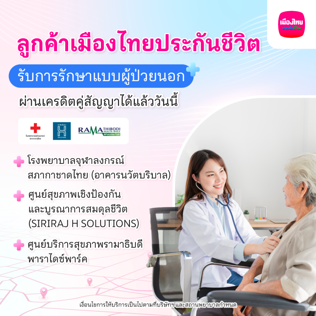 ดังนั้น เมืองไทยประกันชีวิต จึงเดินหน้า สร้างสรรค์บริการที่ช่วยอำนวยความสะดวกแก่ลูกค้าให้มากที่สุด บริการยื่นเคลมการรักษาแบบผู้ป่วยนอก (OPD)ผ่านระบบเครดิตคู่สัญญา (Cashless Claim) โดยไม่ต้องสำรองจ่ายที่เรานำมาให้บริการในครั้งนี้ คืออีกหนึ่งบทพิสูจน์ของความตั้งใจในการใส่ใจดูแลลูกค้าอย่างแท้จริง ซึ่งไม่ใช่แค่เรื่องของการจ่ายค่าสินไหมเท่านั้น แต่เป็นเรื่องของ ‘ประสบการณ์ของลูกค้า’ ที่เราพยายามเติมเต็มให้ดีที่สุดในทุกจุดสัมผัสของการบริการ” โดยลูกค้าเมืองไทยประกันชีวิตสามารถใช้บริการยื่นเคลม OPD แบบไม่ต้องสำรองจ่ายตามสิทธิความคุ้มครองของกรมธรรม์ ได้แล้ววันนี้ ณ สถานพยาบาลชั้นนำที่เข้าร่วมโครงการ โดยล่าสุดมีสถานพยาบาลพันธมิตรใหม่เพิ่มขึ้นอีก 3 แห่ง ได้แก่