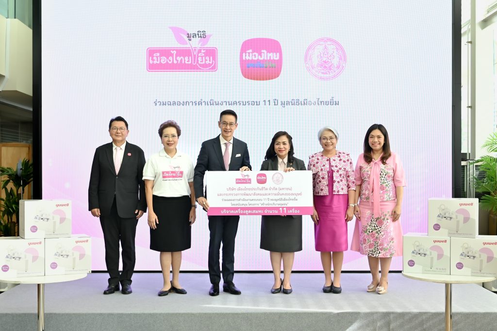 เมืองไทยประกันชีวิตและมูลนิธิเมืองไทยยิ้ม ร่วมมอบเครื่องดูดเสมหะ จำนวน 11 เครื่อง แก่กรมกิจการสตรีและสถาบันครอบครัว กระทรวงการพัฒนาสังคมและความมั่นคงของมนุษย์ เพื่อใช้ในการฝึกอบรมหลักสูตรผู้บริบาลคุ้มครองสิทธิผู้สูงอายุ ซึ่งเป็นหลักสูตรที่มุ่งสร้างอาชีพและพัฒนาทักษะให้แก่ประชาชน โดยเฉพาะกลุ่มสตรีและครอบครัวกลุ่มเปราะบาง เพื่อให้สามารถประกอบอาชีพเป็นผู้ดูแลผู้สูงอายุ (Care Giver) ได้อย่างมีคุณภาพ