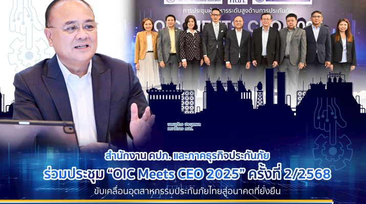 เมื่อวันที่ 14 กรกฎาคม 2568 สำนักงานคณะกรรมการกำกับและส่งเสริมการประกอบธุรกิจประกันภัย (สำนักงาน คปภ.) จัดการประชุมผู้บริหารระดับสูงด้านการประกันภัย “OIC Meets CEO 2025” ครั้งที่ 2/2568 โดยนายชูฉัตร ประมูลผล เลขาธิการคณะกรรมการกำกับและส่งเสริมการประกอบธุรกิจประกันภัย (เลขาธิการ คปภ.) เป็นประธานการประชุม ร่วมกับ นายสาระ ลํ่าซำ ประธานสภาธุรกิจประกันภัยไทย นางนุสรา (อัสสกุล) บัญญัติปิยพจน์ นายกสมาคมประกันชีวิตไทย ดร.สมพร สืบถวิลกุล นายกสมาคมประกันวินาศภัยไทย พร้อมด้วย ผู้บริหารสำนักงาน คปภ. ผู้บริหารสมาคมประกันชีวิตไทย ผู้บริหารสมาคมประกันวินาศภัยไทย และผู้บริหารบริษัทประกันภัยเข้าร่วม ณ ห้องชัยพฤกษ์ 2 หอประชุมกองทัพอากาศ (ทองใหญ่) กรุงเทพมหานคร