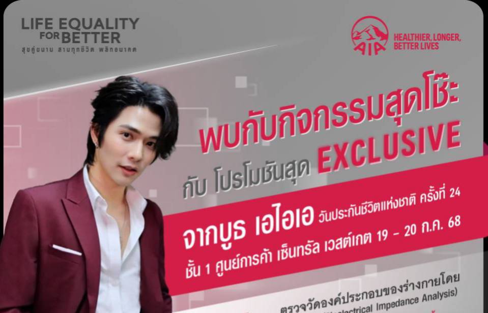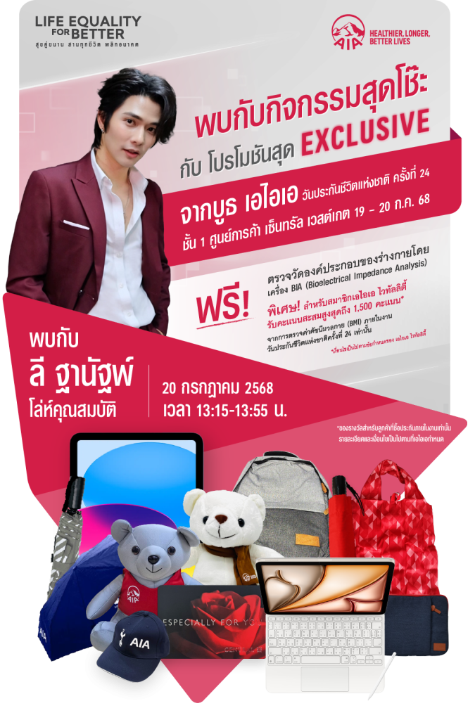 นอกจากนี้ เอไอเอยังได้เตรียมโปรโมชันสุดพิเศษมาให้สำหรับลูกค้าที่ซื้อผลิตภัณฑ์ภายในงาน และพบกับ “ลี ฐานัฐพ์ โล่ห์คุณสมบัติ” ซึ่งจะมามอบความบันเทิงและสร้างรอยยิ้มให้กับแฟน ๆ ในวันอาทิตย์ที่ 20 กรกฎาคม เวลา 13.15 – 13.55 น. ยิ่งไปกว่านั้น ยังมีบูธกิจกรรม AIA ONE BILLION DAY 2025 ที่เปิดต้อนรับผู้ที่สนใจร่วมวิ่งเทรลและ Fun Run พร้อมสนุกกับคอนเสิร์ตจากศิลปินสุดฮิตในตำนาน โดยผู้ที่สนใจสามารถสมัครเข้าร่วมกิจกรรม AIA ONE BILLION DAY 2025 ได้ภายในงาน พร้อมรับของที่ระลึก Limited Edition