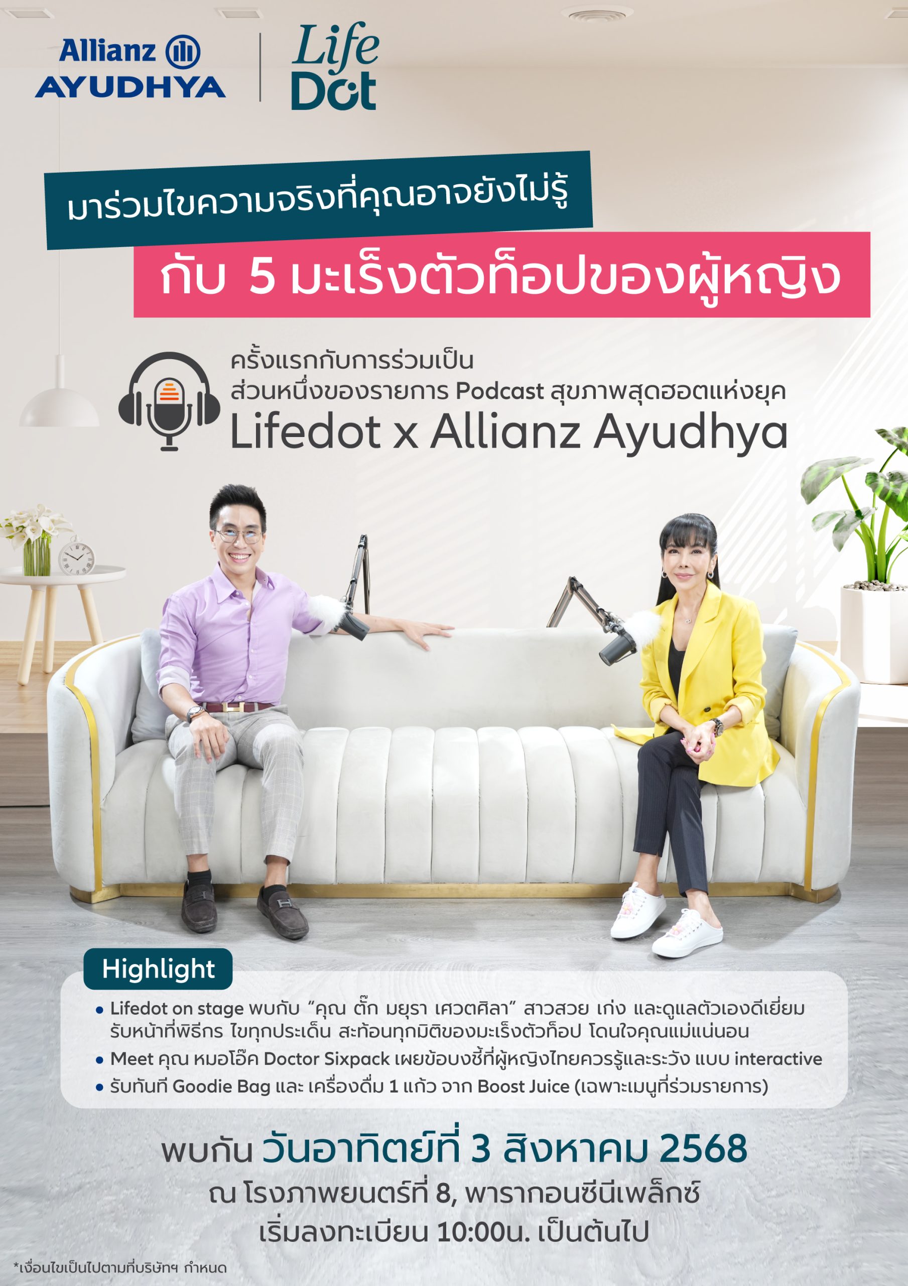 บมจ.อลิอันซ์ อยุธยา ร่วมกับ Lifedot แพลตฟอร์มทอล์กที่จะเปลี่ยนชีวิตคุณในทุกมิติ ยกเวทีจากออนไลน์รายการ TUCK Talk Podcast มานั่งคุยแบบ On Stage โดย ตั๊ก–มยุรา เศวตศิลา สาวสวย เก่ง และดูแลตัวเองดีเยี่ยม รับหน้าที่พิธีกร ไขทุกประเด็น สะท้อนทุกมิติของมะเร็งตัวท็อป โดย นายแพทย์ศุภฤกษ์ วิจารณาญาณ หรือหมอโอ๊ค เจ้าของเพจ Doctor Sixpack ที่จะมาเผยข้อบงชี้ที่ผู้หญิงไทยควรรู้และระวัง กับ 5 มะเร็งตัวท็อปของผู้หญิง รับชมวิดีโอรายละเอียดเพิ่มเติม https://shorturl.asia/TNQrl