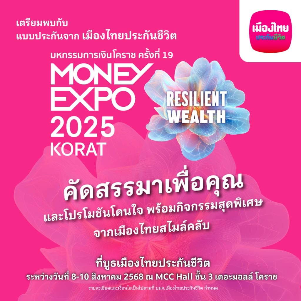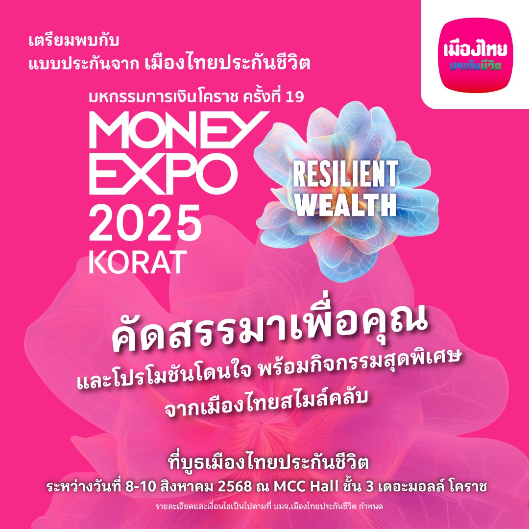 แล้วพบกันที่ บูธเมืองไทยประกันชีวิต ในงานมหกรรมการเงินโคราช ครั้งที่ 19 “Money Expo 2025 Korat” ระหว่างวันที่ 8-10 สิงหาคม 2568 ณ MCC Hall ชั้น 3 เดอะมอลล์ โคราช #เมืองไทยประกันชีวิต #MuangThaiLife