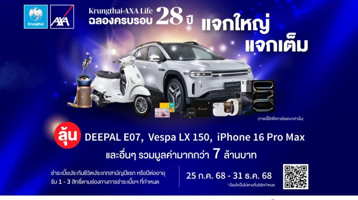 บมจ.กรุงไทย-แอกซ่า ประกันชีวิต จัดแคมเปญพิเศษ “แจกใหญ่ แจกเต็ม” ในโอกาสฉลองครบรอบ 28 ปี ของบริษัทฯ และเพื่อเป็นการตอบแทนลูกค้าคนสำคัญทุกท่าน โดยแคมเปญนี้เป็นการเชิญชวนลูกค้าร่วมสนุกและลุ้นรางวัลใหญ่ รถยนต์ DEEPAL E07 Performance AWD พร้อมอุปกรณ์ชาร์จไฟ, รถจักรยานยนต์ Vespa LX 150, iPhone 16 Pro Max และรางวัลอื่นๆ มูลค่ารวมกว่า 7 ล้านบาท โดยกิจกรรมจะเริ่มตั้งแต่วันนี้ – 31 ธันวาคม 2568