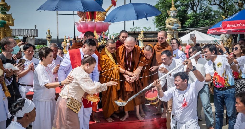 ทั้งนี้ “หลวงตาม้า” วัดถ้ำเมืองนะ ท่านเมตตาเดินทางมาเป็นประธานพิธีฝ่ายสงฆ์ นั่งอธิษฐานจิตลงแผ่นทอง และ ธาตุวัตถุมงคลต่างๆ พร้อมคณะสงฆ์ที่ติดตามมา หลายรูป และ พระครูเกษมถาวรคุณ เจ้าอาวาสวัดบางเลน ร่วมพระสงฆ์ 9 รูป สวดเจริญพุทธมนต์ ชยันโต”ชัยชนะจงบังเกิด” ตลอดพิธีเททอง จนแล้วเสร็จ…