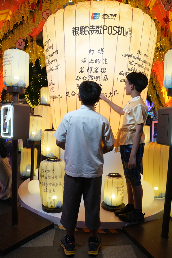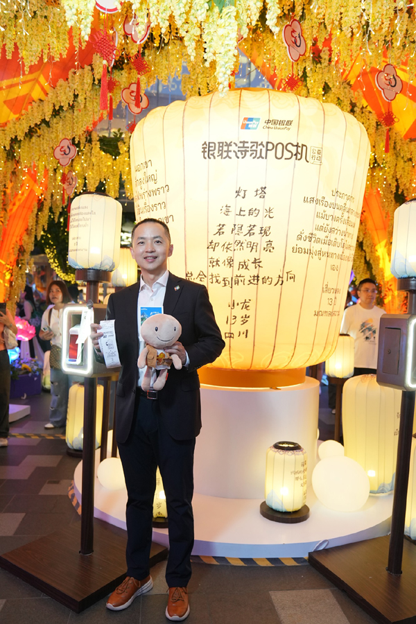 เนื่องในโอกาสครบรอบ 50 ปี การสถาปนาความสัมพันธ์ทางการทูตระหว่างจีนกับไทย “บทกวีจากเครื่อง POS UnionPay” ได้จัดขึ้นภายในเทศกาลโคมไฟจีน ประเทศไทย ได้นำบทกวีจากเด็กๆ บนภูเขาของจีนมาสู่ประเทศไทยเป็นครั้งแรก โครงการการกุศลนี้ภายใต้ธีม “แสงกวีส่องดวงใจ (Poetry Lights the Heart’s Lantern)” มีจุดมุ่งหมายที่จะใช้โคมไฟเป็นสื่อกลาง และบทกวีเปรียบเสมือนจิตวิญญาณ สลักบทกวีอันบริสุทธิ์ของเด็กๆ บนภูเขาลงบนโคมไฟ โคมไฟเหล่านี้เปรียบเสมือนทูตแห่งบทสนทนาระหว่างอารยธรรม ส่งต่อบทกวีของเด็กๆ และเบ่งบานไปตามเส้นทางสายไหมของโครงการหนึ่งแถบหนึ่งเส้นทางเลียบแม่น้ำเจ้าพระยา