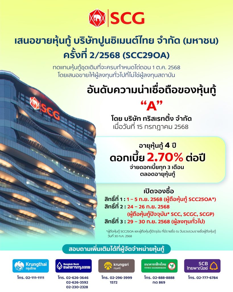 เอสซีจี เตรียมเสนอขายหุ้นกู้ชุดใหม่ ครั้งที่ 2/2568 ของบริษัทปูนซิเมนต์ไทย จำกัด (มหาชน) “SCC29OA” จำนวน 25,000 ล้านบาท อายุหุ้นกู้ 4 ปี ครบกำหนดไถ่ถอนปี พ.ศ. 2572 อัตราดอกเบี้ยคงที่ 2.70% ต่อปี จ่ายดอกเบี้ยทุก 3 เดือน อันดับความน่าเชื่อถือหุ้นกู้ระดับ A จาก บริษัท ทริสเรทติ้ง จำกัด สะท้อนสถานะทางการเงินของเอสซีจีที่แข็งแกร่ง โดยเปิดให้จองซื้อตั้งแต่วันที่ 1 ก.ย. 2568*